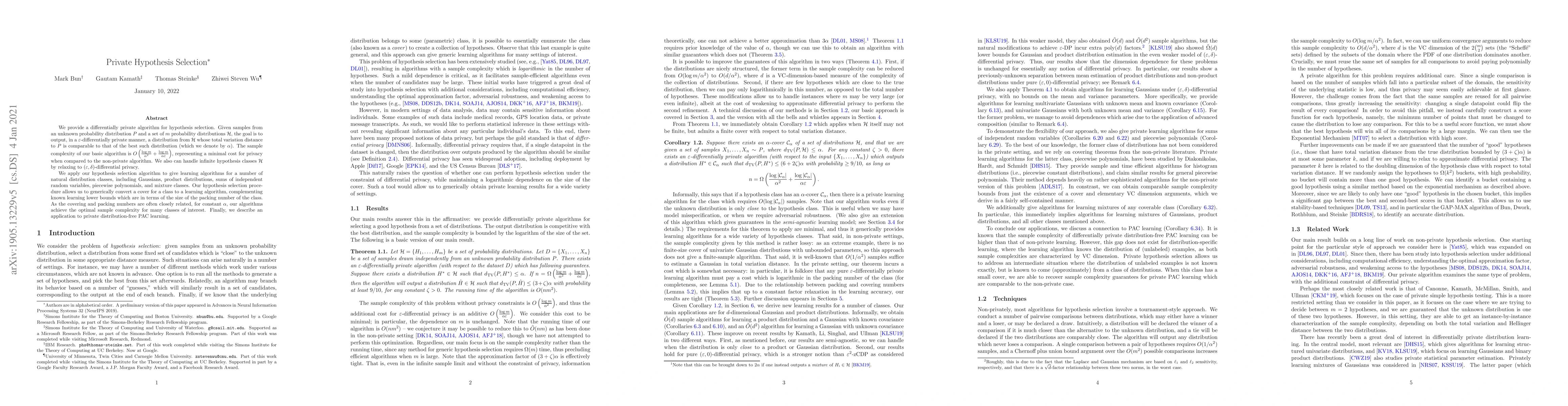 This paper presents a differentially private algorithm for selecting the best hypothesis from a given set of distributions that approximates an unknown distribution. The algorithm achieves optimal sample complexity for many classes, including Gaussians and mixtures, and applies to infinite hypothesis classes with $(\varepsilon,\delta)$-differential privacy.