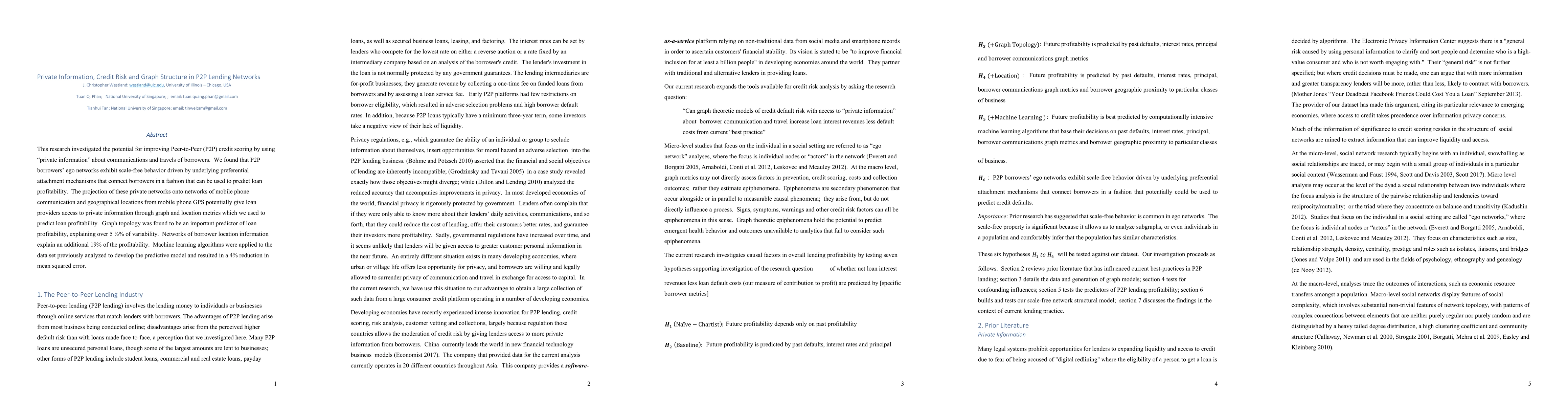 This research investigated the potential for improving Peer-to-Peer (P2P) credit scoring by using "private information" about communications and travels of borrowers. We found that P2P borrowers' ego networks exhibit scale-free behavior driven by underlying preferential attachment mechanisms that connect borrowers in a fashion that can be used to predict loan profitability. The projection of these private networks onto networks of mobile phone communication and geographical locations from mobile phone GPS potentially give loan providers access to private information through graph and location metrics which we used to predict loan profitability. Graph topology was found to be an important predictor of loan profitability, explaining over 5.5% of variability. Networks of borrower location information explain an additional 19% of the profitability. Machine learning algorithms were applied to the data set previously analyzed to develop the predictive model and resulted in a 4% reduction in mean squared error.