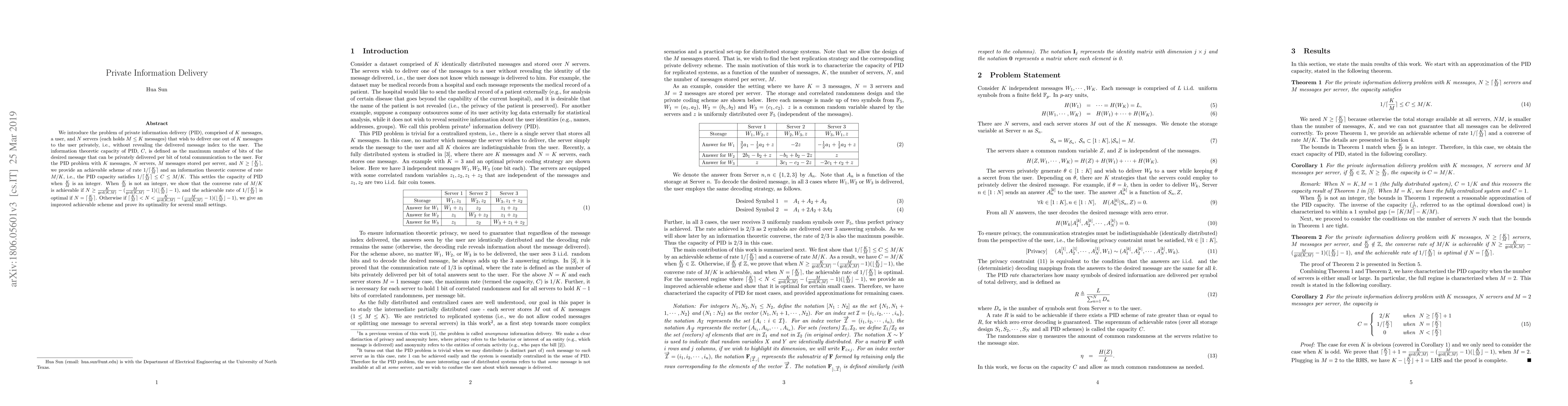 We introduce the problem of private information delivery (PID), comprised of $K$ messages, a user, and $N$ servers (each holds $M\leq K$ messages) that wish to deliver one out of $K$ messages to the user privately, i.e., without revealing the delivered message index to the user. The information theoretic capacity of PID, $C$, is defined as the maximum number of bits of the desired message that can be privately delivered per bit of total communication to the user. For the PID problem with $K$ messages, $N$ servers, $M$ messages stored per server, and $N \geq \lceil \frac{K}{M} \rceil$, we provide an achievable scheme of rate $1/\lceil \frac{K}{M} \rceil$ and an information theoretic converse of rate $M/K$, i.e., the PID capacity satisfies $1/\lceil \frac{K}{M} \rceil \leq C \leq M/K$. This settles the capacity of PID when $\frac{K}{M}$ is an integer. When $\frac{K}{M}$ is not an integer, we show that the converse rate of $M/K$ is achievable if $N \geq \frac{K}{\gcd(K,M)} - (\frac{M}{\gcd(K,M)}-1)(\lfloor \frac{K}{M} \rfloor -1)$, and the achievable rate of $1/\lceil \frac{K}{M} \rceil$ is optimal if $N = \lceil \frac{K}{M} \rceil$. Otherwise if $\lceil \frac{K}{M} \rceil < N < \frac{K}{\gcd(K,M)} - (\frac{M}{\gcd(K,M)}-1)(\lfloor \frac{K}{M} \rfloor -1)$, we give an improved achievable scheme and prove its optimality for several small settings.