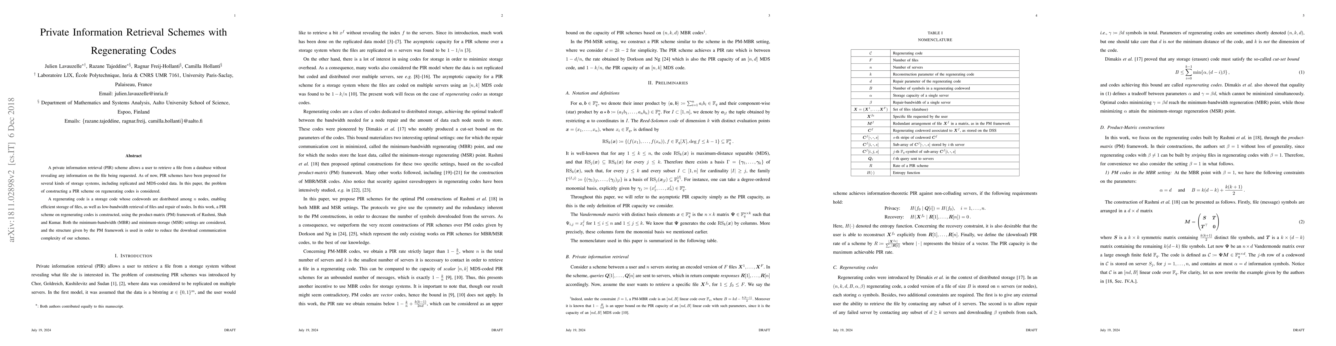 This paper constructs a private information retrieval (PIR) scheme for databases using regenerating codes, which optimize storage and enable efficient file retrieval and node repair. The proposed scheme leverages the product-matrix framework to minimize bandwidth and storage requirements in both minimum-bandwidth and minimum-storage settings.