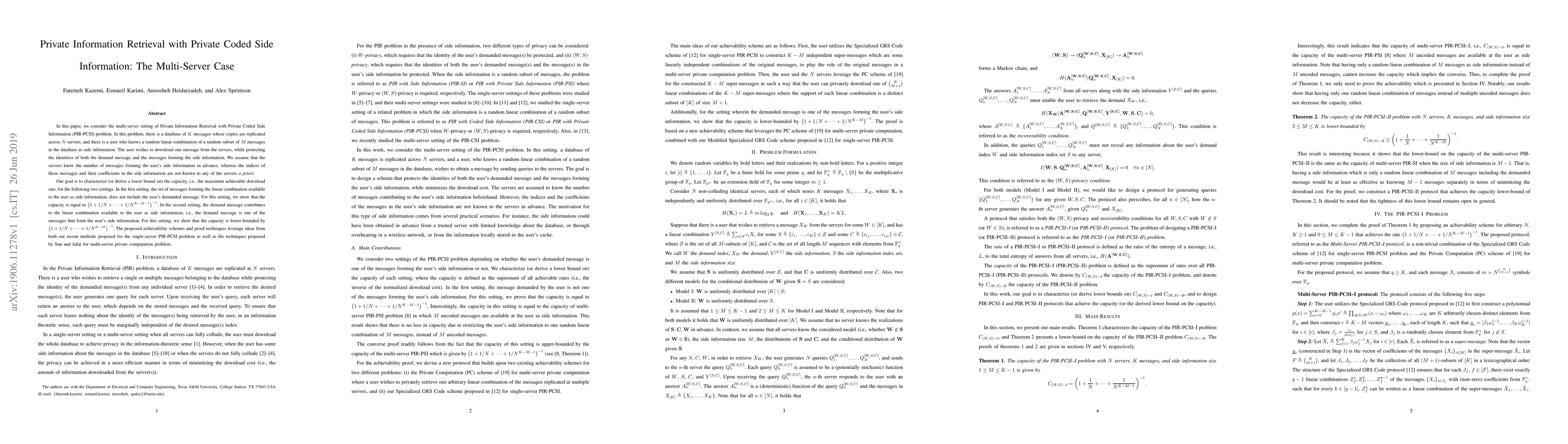 This paper investigates the Private Information Retrieval (PIR) with Private Coded Side Information (PCSI) in a multi-server setting, aiming to determine the maximum achievable download rate while protecting the identities of both the demand message and side information. The authors derive capacity expressions for two scenarios: one where the demand message does not form part of the side information, and another where it does.