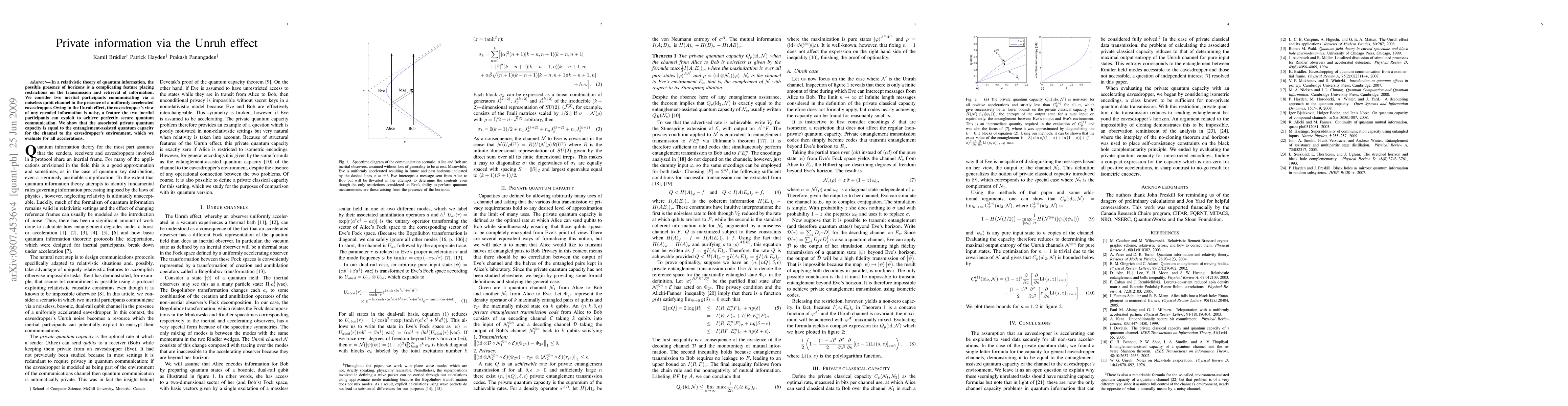 In a relativistic theory of quantum information, the possible presence of horizons is a complicating feature placing restrictions on the transmission and retrieval of information. We consider two inertial participants communicating via a noiseless qubit channel in the presence of a uniformly accelerated eavesdropper. Owing to the Unruh effect, the eavesdropper's view of any encoded information is noisy, a feature the two inertial participants can exploit to achieve perfectly secure quantum communication. We show that the associated private quantum capacity is equal to the entanglement-assisted quantum capacity for the channel to the eavesdropper's environment, which we evaluate for all accelerations.