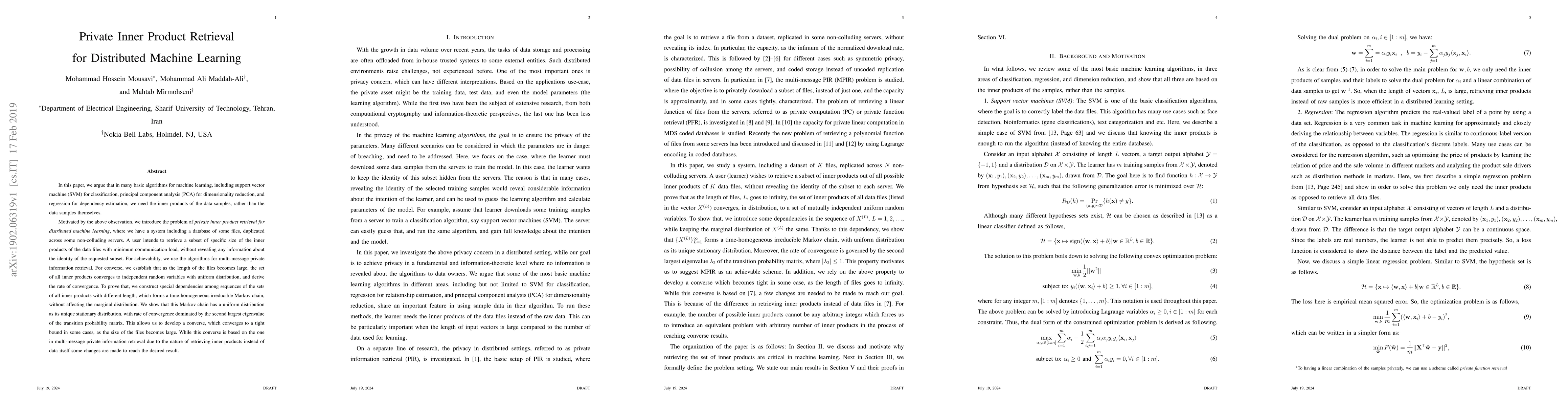 In this paper, we argue that in many basic algorithms for machine learning, including support vector machine (SVM) for classification, principal component analysis (PCA) for dimensionality reduction, and regression for dependency estimation, we need the inner products of the data samples, rather than the data samples themselves. Motivated by the above observation, we introduce the problem of private inner product retrieval for distributed machine learning, where we have a system including a database of some files, duplicated across some non-colluding servers. A user intends to retrieve a subset of specific size of the inner products of the data files with minimum communication load, without revealing any information about the identity of the requested subset. For achievability, we use the algorithms for multi-message private information retrieval. For converse, we establish that as the length of the files becomes large, the set of all inner products converges to independent random variables with uniform distribution, and derive the rate of convergence. To prove that, we construct special dependencies among sequences of the sets of all inner products with different length, which forms a time-homogeneous irreducible Markov chain, without affecting the marginal distribution. We show that this Markov chain has a uniform distribution as its unique stationary distribution, with rate of convergence dominated by the second largest eigenvalue of the transition probability matrix. This allows us to develop a converse, which converges to a tight bound in some cases, as the size of the files becomes large. While this converse is based on the one in multi-message private information retrieval, due to the nature of retrieving inner products instead of data itself some changes are made to reach the desired result.