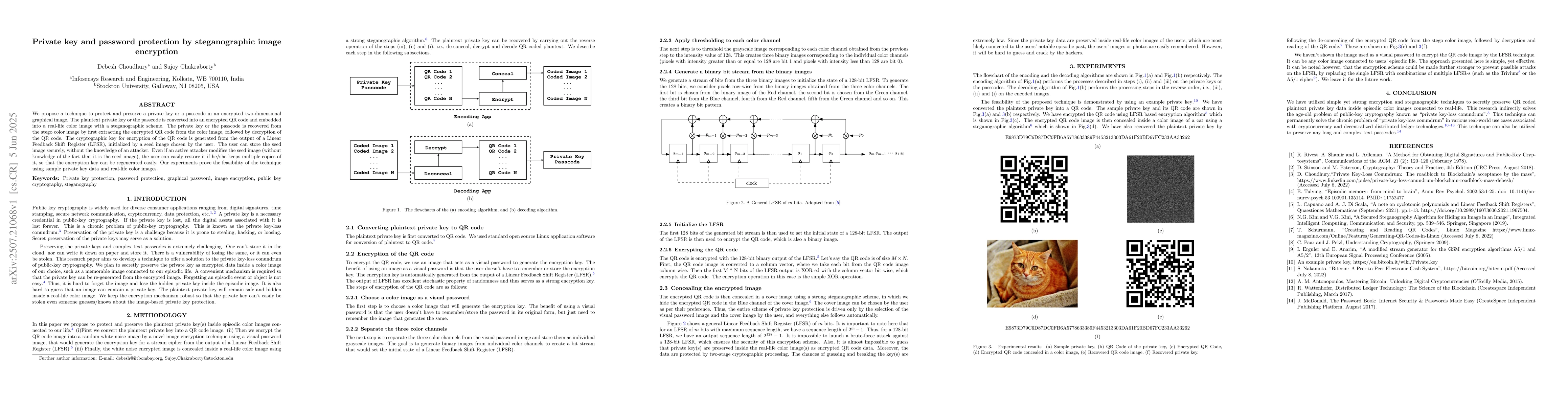 We propose a technique to protect and preserve a private key or a passcode in an encrypted two-dimensional graphical image. The plaintext private key or the passcode is converted into an encrypted QR code and embedded into a real-life color image with a steganographic scheme. The private key or the passcode is recovered from the stego color image by first extracting the encrypted QR code from the color image, followed by decryption of the QR code. The cryptographic key for encryption of the QR code is generated from the output of a Linear Feedback Shift Register (LFSR), initialized by a seed image chosen by the user. The user can store the seed image securely, without the knowledge of an attacker. Even if an active attacker modifies the seed image (without knowledge of the fact that it is the seed image), the user can easily restore it if he/she keeps multiple copies of it, so that the encryption key can be regenerated easily. Our experiments prove the feasibility of the technique using sample private key data and real-life color images.