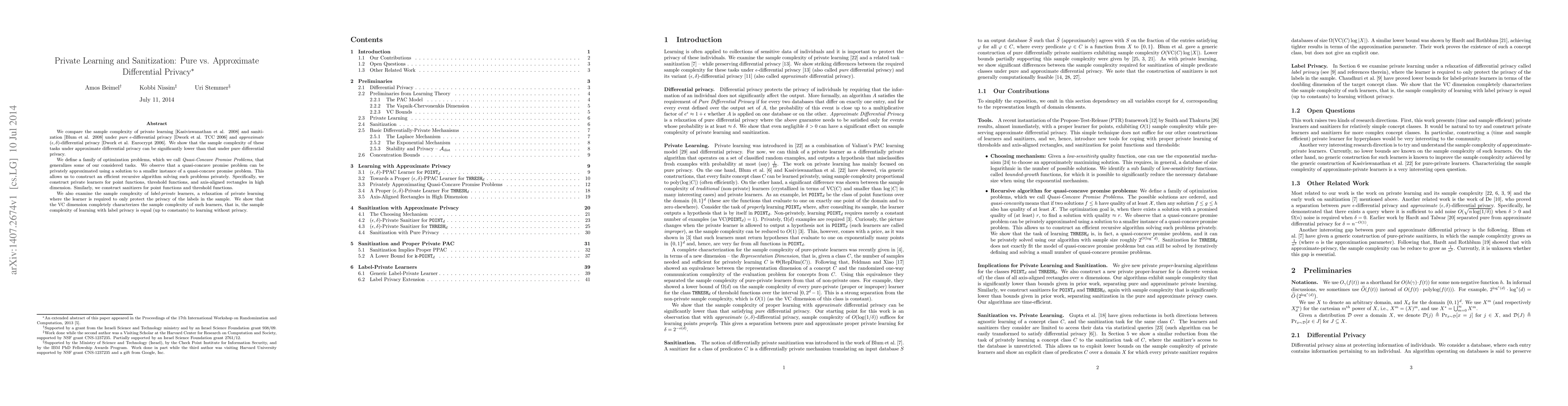 This paper compares the sample complexity of private learning and sanitization under pure and approximate differential privacy, demonstrating that approximate privacy can significantly reduce sample complexity. It introduces Quasi-Concave Promise Problems and presents a recursive algorithm for efficiently solving these problems privately, constructing private learners and sanitizers for various functions. Additionally, it shows that label-private learners have sample complexity equivalent to non-private learners, characterized by the VC dimension.