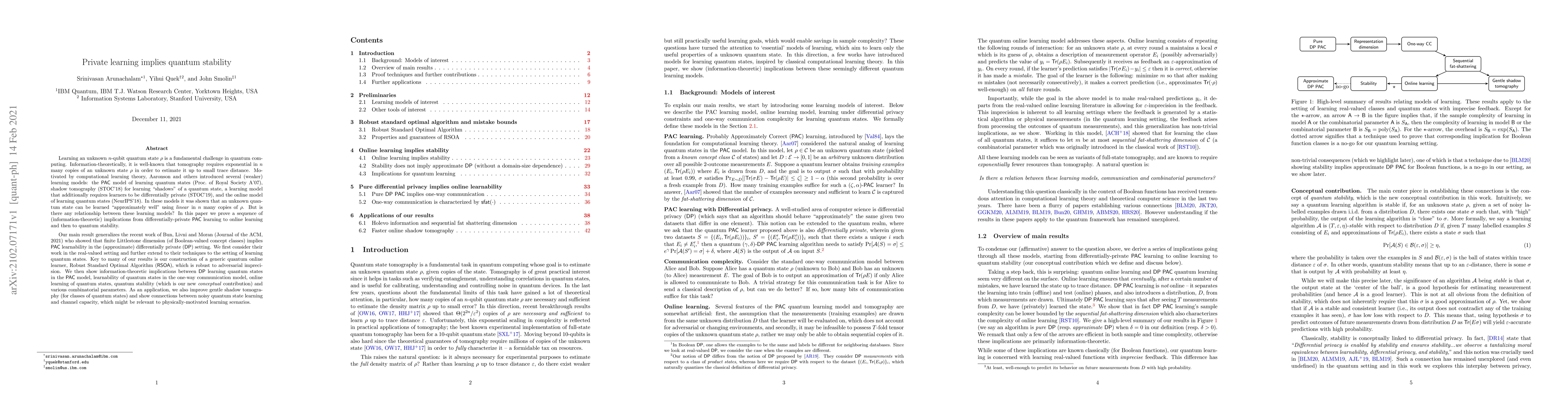 This paper explores the relationship between various quantum learning models, proving information-theoretic implications from differentially-private PAC learning to quantum stability. It introduces a robust quantum online learner, the Robust Standard Optimal Algorithm (RSOA), and extends techniques from Boolean concept classes to quantum states, demonstrating connections between PAC learning, communication complexity, online learning, and quantum stability.