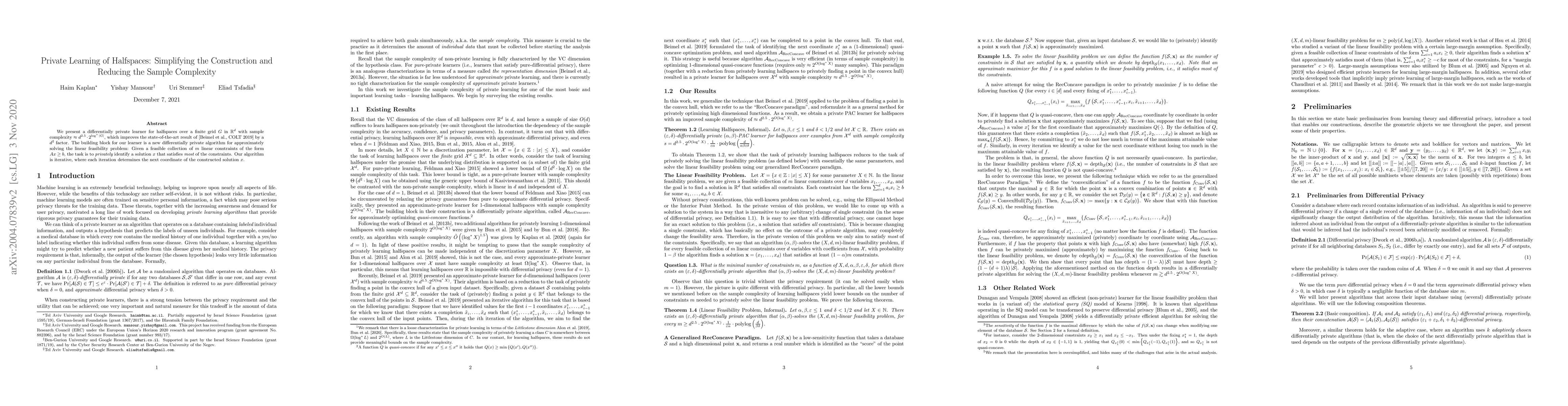 This paper introduces a differentially private learner for halfspaces, achieving improved sample complexity by a $d^2$ factor over previous methods. The core innovation is a new differentially private algorithm for solving linear feasibility problems iteratively, enhancing the construction process.