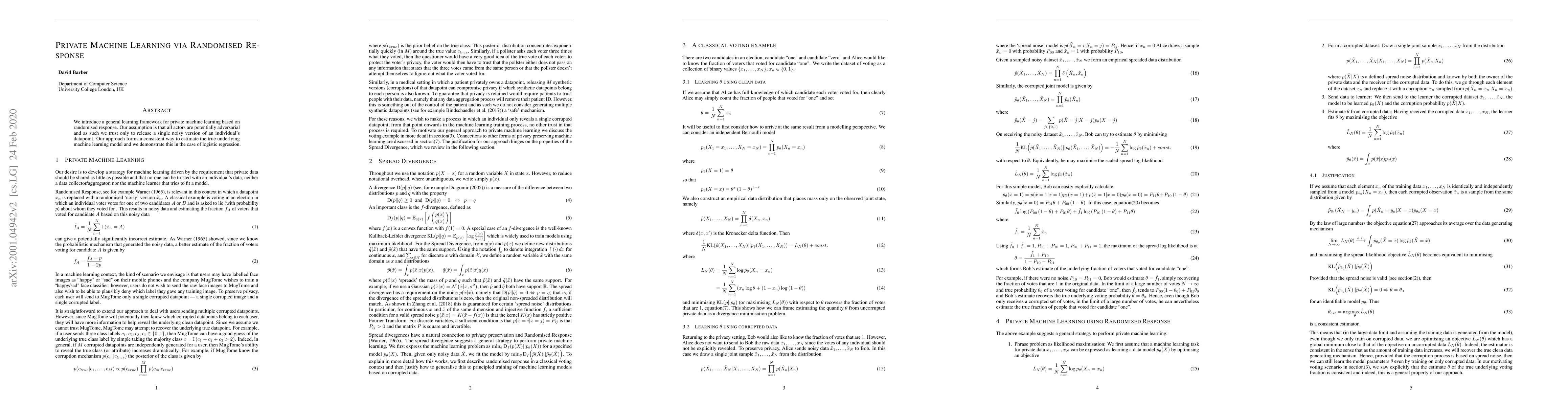 We introduce a general learning framework for private machine learning based on randomised response. Our assumption is that all actors are potentially adversarial and as such we trust only to release a single noisy version of an individual's datapoint. We discuss a general approach that forms a consistent way to estimate the true underlying machine learning model and demonstrate this in the case of logistic regression.