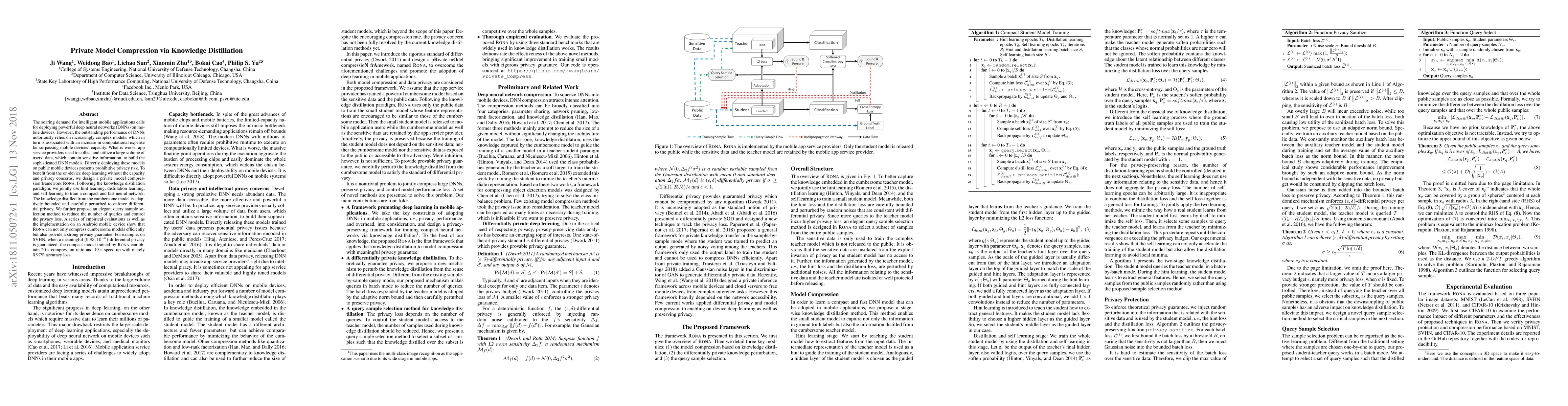 This paper introduces RONA, a private model compression framework that leverages knowledge distillation to train compact and fast neural networks for mobile devices while ensuring differential privacy. RONA achieves significant model compression and speed-up with minimal accuracy loss, demonstrating strong privacy guarantees.