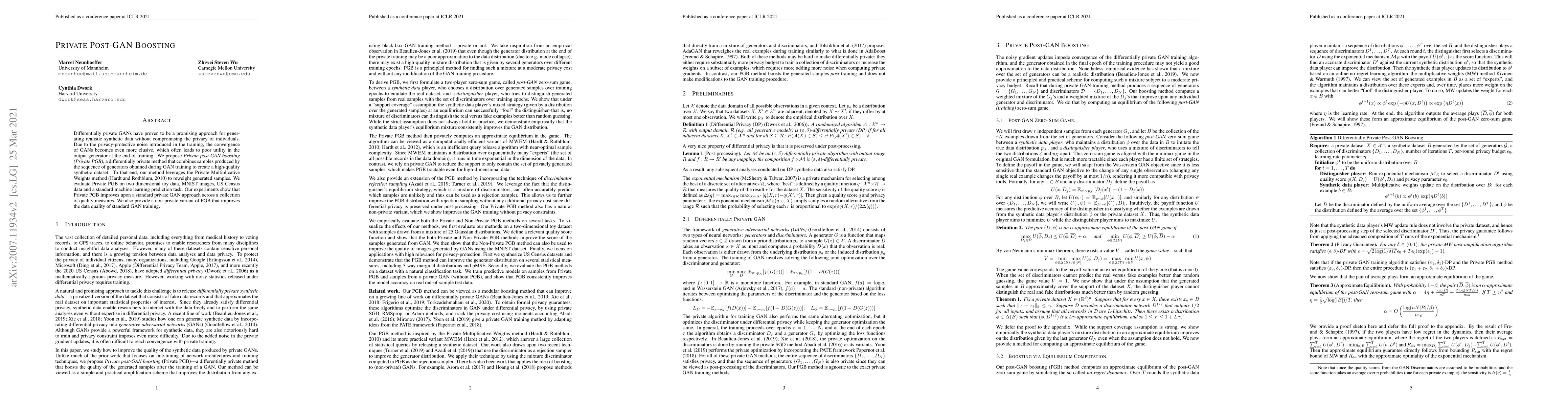 The paper introduces Private Post-GAN Boosting (Private PGB), a method to enhance the utility of synthetic data generated by differentially private GANs by combining outputs from multiple generators using the Private Multiplicative Weights method. Experiments demonstrate improved synthetic data quality and utility over standard private GANs.