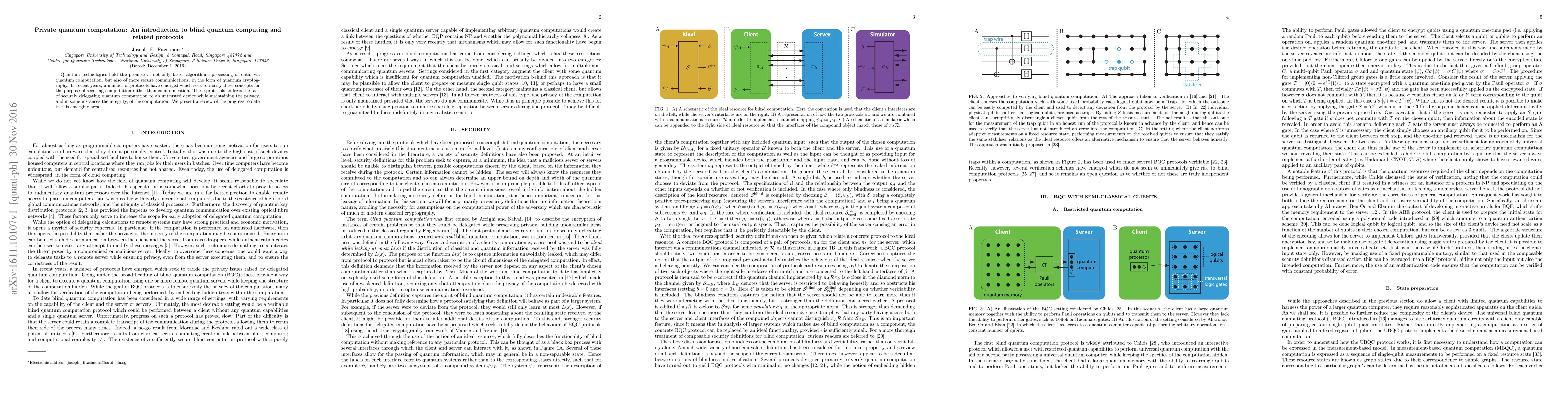 This paper reviews blind quantum computing and related protocols that aim to securely delegate quantum computation to an untrusted device while preserving the privacy and integrity of the computation, merging quantum computation with quantum cryptography for enhanced security. The paper highlights the progress made in this emerging field.