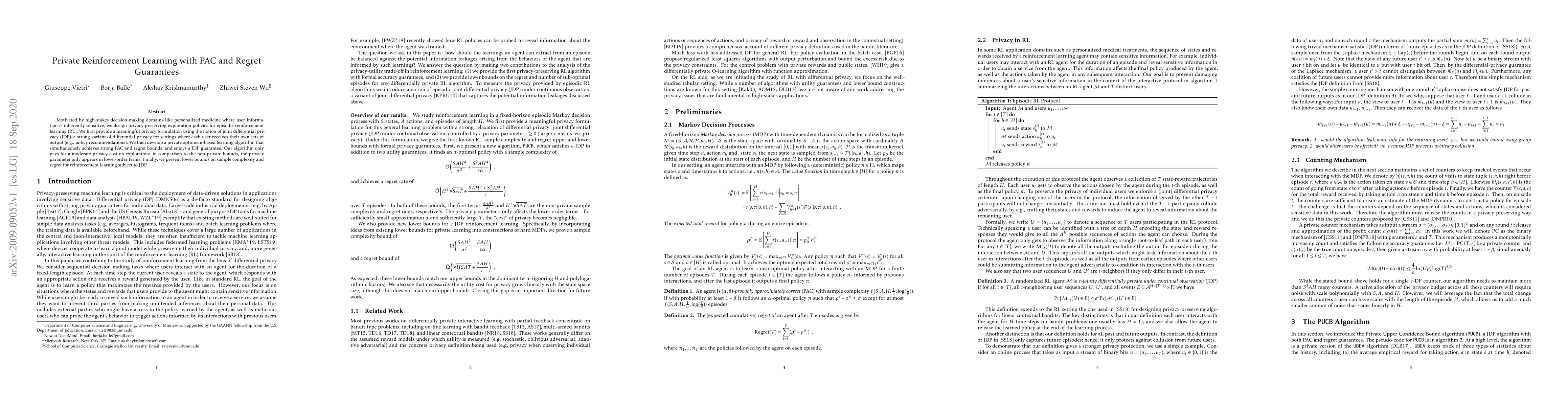 This paper designs privacy-preserving exploration policies for reinforcement learning under joint differential privacy, achieving strong PAC and regret bounds while minimizing privacy costs. It introduces a private optimism-based learning algorithm and presents lower bounds on sample complexity and regret for such settings.