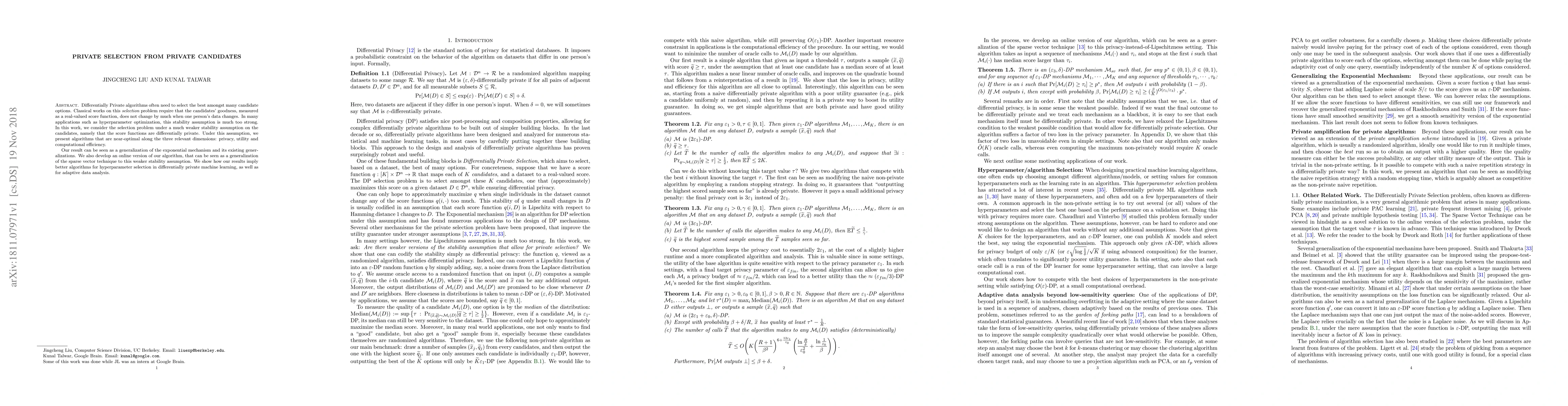 Differentially Private algorithms often need to select the best amongst many candidate options. Classical works on this selection problem require that the candidates' goodness, measured as a real-valued score function, does not change by much when one person's data changes. In many applications such as hyperparameter optimization, this stability assumption is much too strong. In this work, we consider the selection problem under a much weaker stability assumption on the candidates, namely that the score functions are differentially private. Under this assumption, we present algorithms that are near-optimal along the three relevant dimensions: privacy, utility and computational efficiency. Our result can be seen as a generalization of the exponential mechanism and its existing generalizations. We also develop an online version of our algorithm, that can be seen as a generalization of the sparse vector technique to this weaker stability assumption. We show how our results imply better algorithms for hyperparameter selection in differentially private machine learning, as well as for adaptive data analysis.