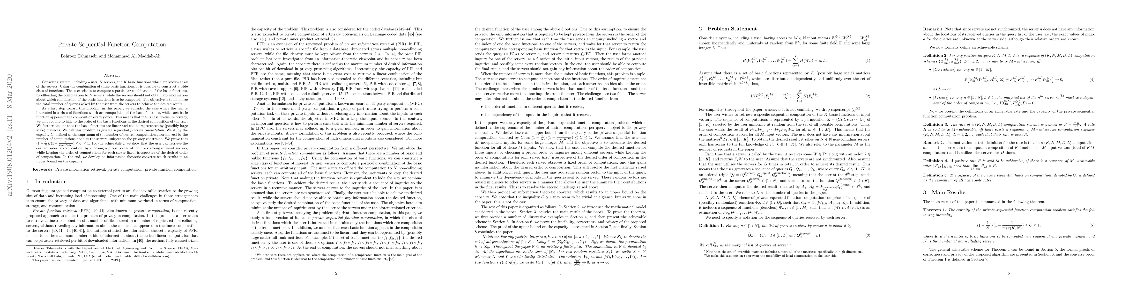 Consider a system, including a user, $N$ servers, and $K$ basic functions which are known at all of the servers. Using the combination of those basic functions, it is possible to construct a wide class of functions. The user wishes to compute a particular combination of the basic functions, by offloading the computation to $N$ servers, while the servers should not obtain any information about which combination of the basic functions is to be computed. The objective is to minimize the total number of queries asked by the user from the servers to achieve the desired result. As a first step toward this problem, in this paper, we consider the case where the user is interested in a class of functions which are composition of the basic functions, while each basic function appears in the composition exactly once. This means that in this case, to ensure privacy, we only require to hide to the order of the basic functions in the desired composition of the user. We further assume that the basic functions are linear and can be represented by (possibly large-scale) matrices. We call this problem as private sequential function computation. We study the capacity $C$, defined as the supremum of the number of desired computations, normalized by the number of computations done at the servers, subject to the privacy constraint. We prove that $(1-\frac{1}{N})/ (1-\frac{1}{\max(K,N)}) \le C \le 1$. For the achievability, we show that the user can retrieve the desired order of composition, by choosing a proper order of inquiries among different servers, while keeping the order of computations for each server fixed, irrespective of the desired order of composition. In the end, we develop an information-theoretic converse which results in an upper bound on the capacity.