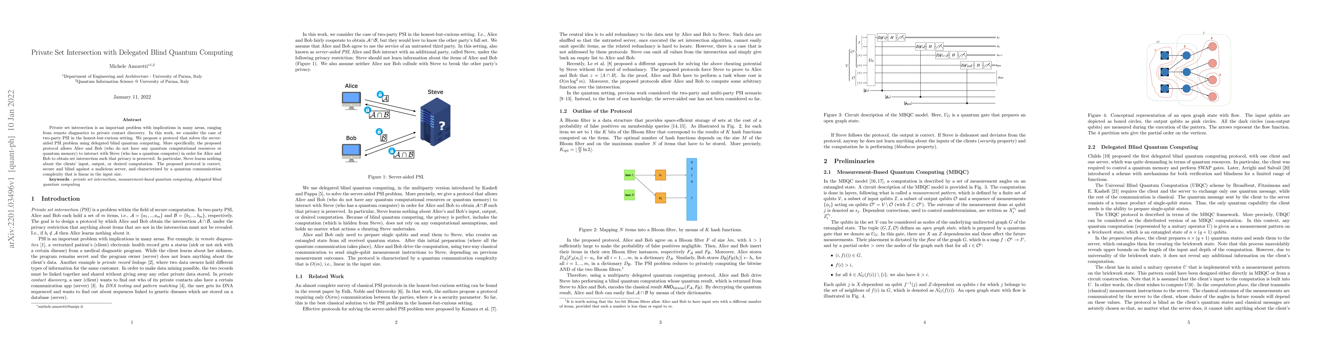 This paper proposes a protocol for private set intersection (PSI) using delegated blind quantum computing, enabling two parties without quantum resources to compute the intersection with a quantum server while preserving privacy and ensuring security against malicious servers. The protocol maintains linear quantum communication complexity relative to input size.