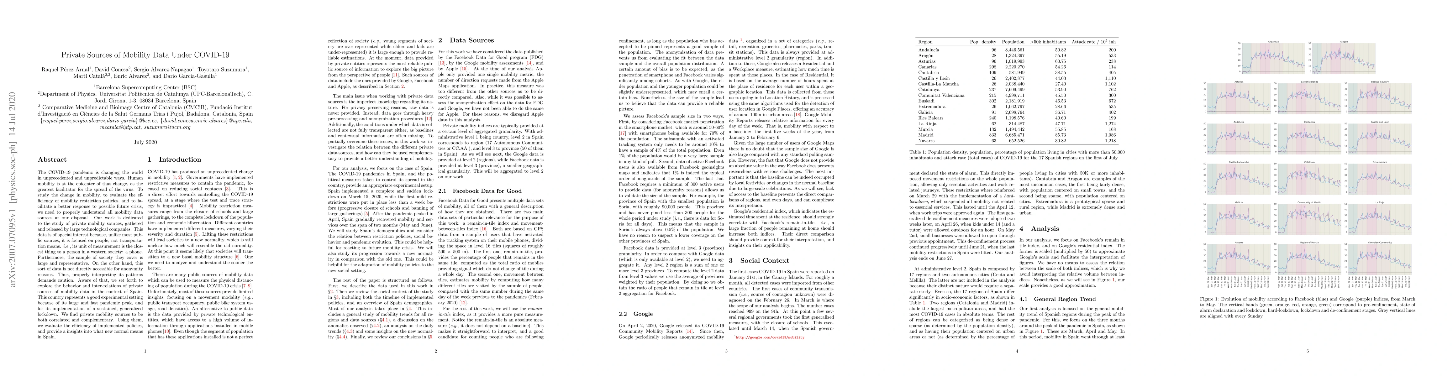 The COVID-19 pandemic is changing the world in unprecedented and unpredictable ways. Human mobility is at the epicenter of that change, as the greatest facilitator for the spread of the virus. To study the change in mobility, to evaluate the efficiency of mobility restriction policies, and to facilitate a better response to possible future crisis, we need to properly understand all mobility data sources at our disposal. Our work is dedicated to the study of private mobility sources, gathered and released by large technological companies. This data is of special interest because, unlike most public sources, it is focused on people, not transportation means. i.e., its unit of measurement is the closest thing to a person in a western society: a phone. Furthermore, the sample of society they cover is large and representative. On the other hand, this sort of data is not directly accessible for anonymity reasons. Thus, properly interpreting its patterns demands caution. Aware of that, we set forth to explore the behavior and inter-relations of private sources of mobility data in the context of Spain. This country represents a good experimental setting because of its large and fast pandemic peak, and for its implementation of a sustained, generalized lockdown. We find private mobility sources to be both correlated and complementary. Using them, we evaluate the efficiency of implemented policies, and provide a insights into what new normal means in Spain.