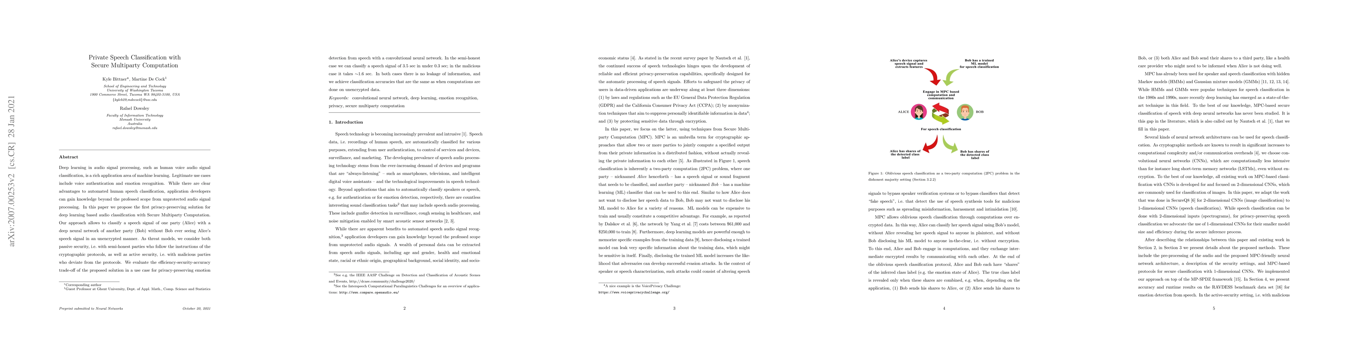 The paper proposes a privacy-preserving solution for deep learning-based audio classification using Secure Multiparty Computation (MPC), allowing classification of a speech signal by one party (Alice) with a deep neural network of another party (Bob) without Bob ever seeing Alice's speech signal in an unencrypted form. The approach is evaluated for privacy-preserving emotion detection from speech with a convolutional neural network, considering both passive and active security models.