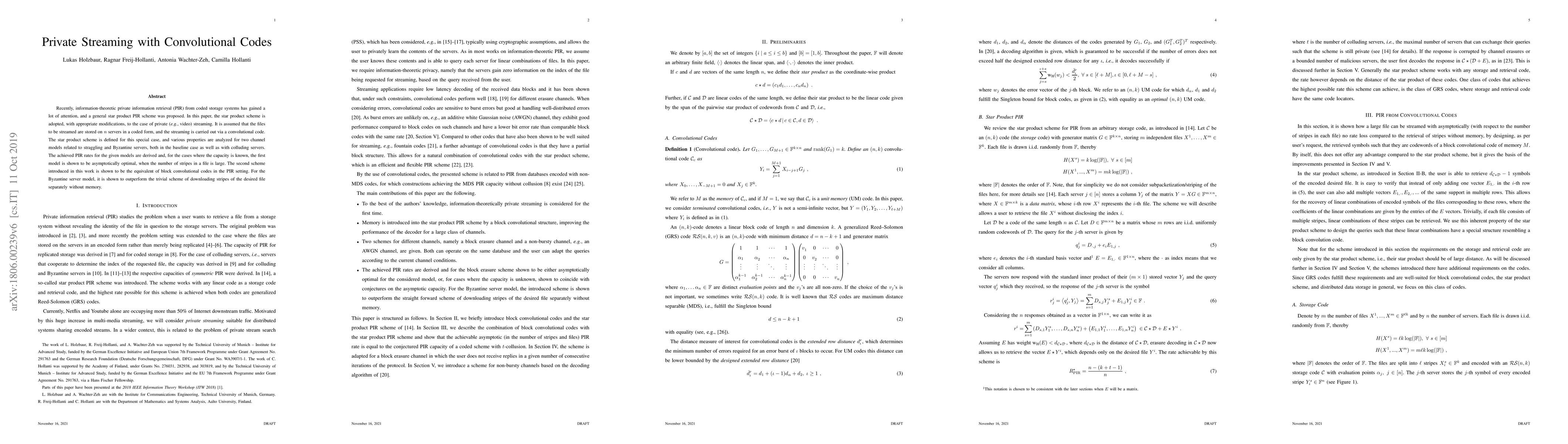 Recently, information-theoretic private information retrieval (PIR) from coded storage systems has gained a lot of attention, and a general star product PIR scheme was proposed. In this paper, the star product scheme is adopted, with appropriate modifications, to the case of private (e.g., video) streaming. It is assumed that the files to be streamed are stored on~$n$ servers in a coded form, and the streaming is carried out via a convolutional code. The star product scheme is defined for this special case, and various properties are analyzed for two channel models related to straggling and Byzantine servers, both in the baseline case as well as with colluding servers. The achieved PIR rates for the given models are derived and, for the cases where the capacity is known, the first model is shown to be asymptotically optimal, when the number of stripes in a file is large. The second scheme introduced in this work is shown to be the equivalent of block convolutional codes in the PIR setting. For the Byzantine server model, it is shown to outperform the trivial scheme of downloading stripes of the desired file separately without memory.