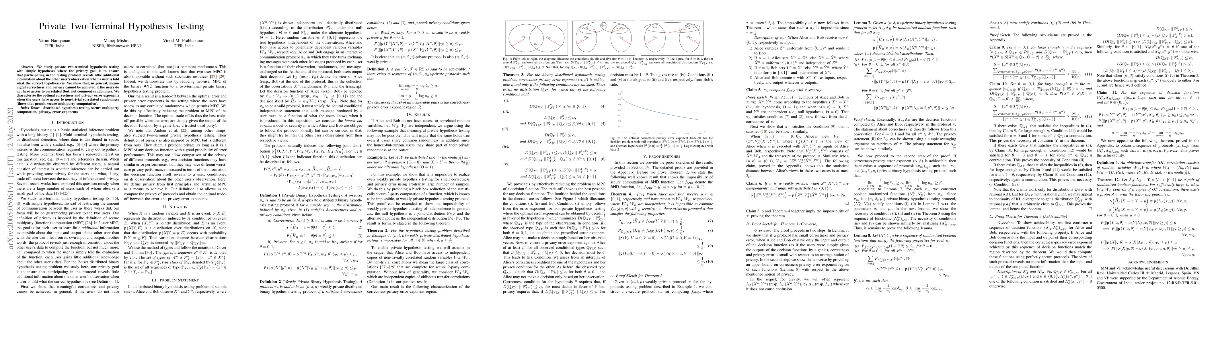 This paper investigates the challenge of private two-terminal hypothesis testing under simple hypotheses, emphasizing privacy goals. It concludes that achieving both meaningful correctness and privacy is impossible without correlated, but not common, randomness, and characterizes the optimal error exponents under such conditions.