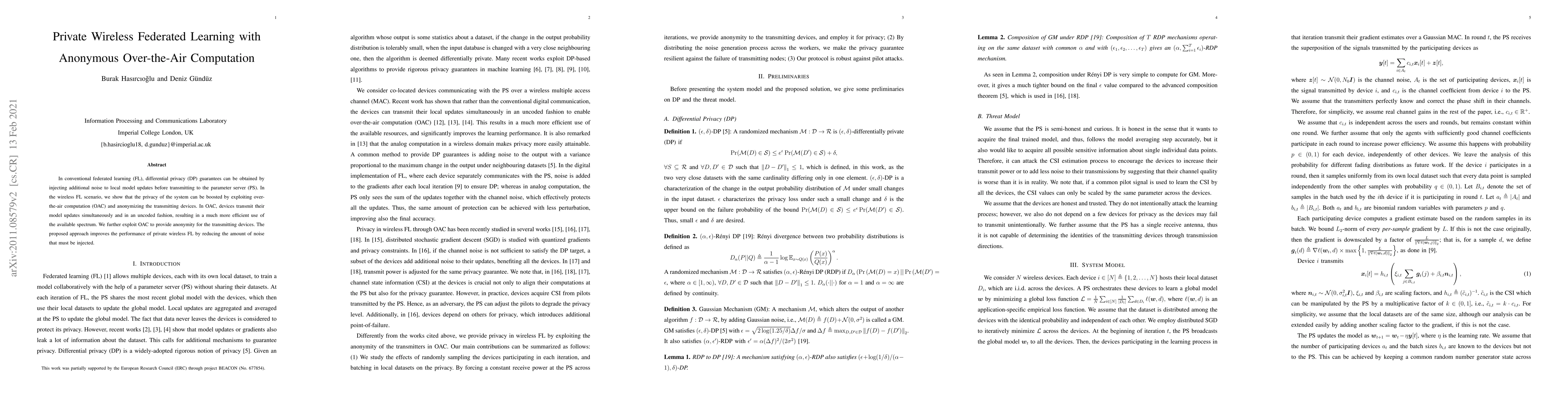 This paper proposes a private wireless federated learning method that enhances privacy through over-the-air computation and device anonymity, reducing the need for additional noise and improving system efficiency. The approach leverages simultaneous, uncoded transmission of model updates to boost both privacy and performance.