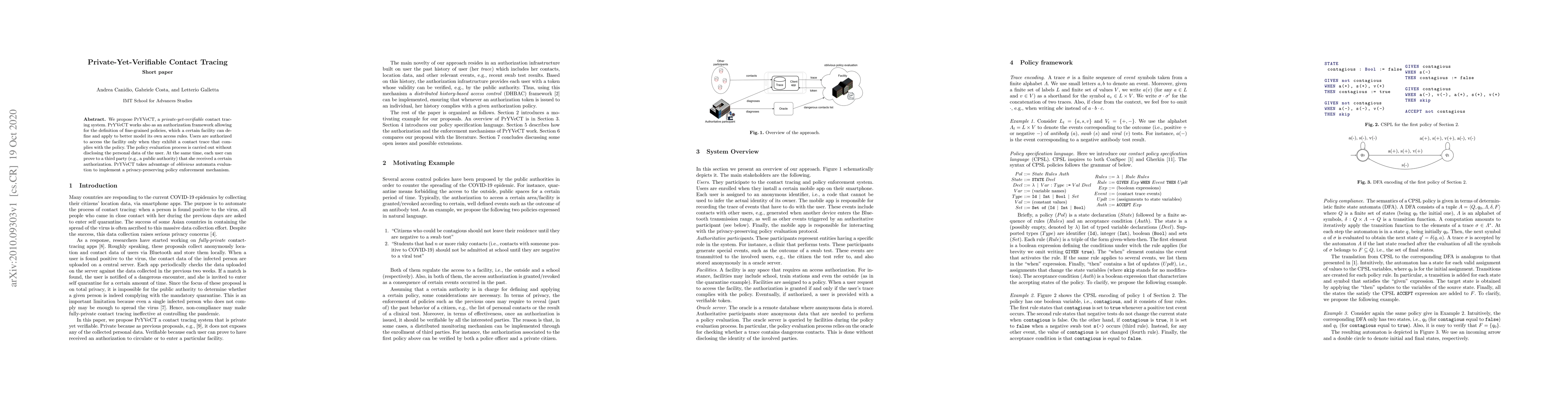 PrYVeCT is a private-yet-verifiable contact tracing system that enforces fine-grained access policies without disclosing personal data. It allows users to prove authorization to third parties while maintaining privacy through oblivious automata evaluation.