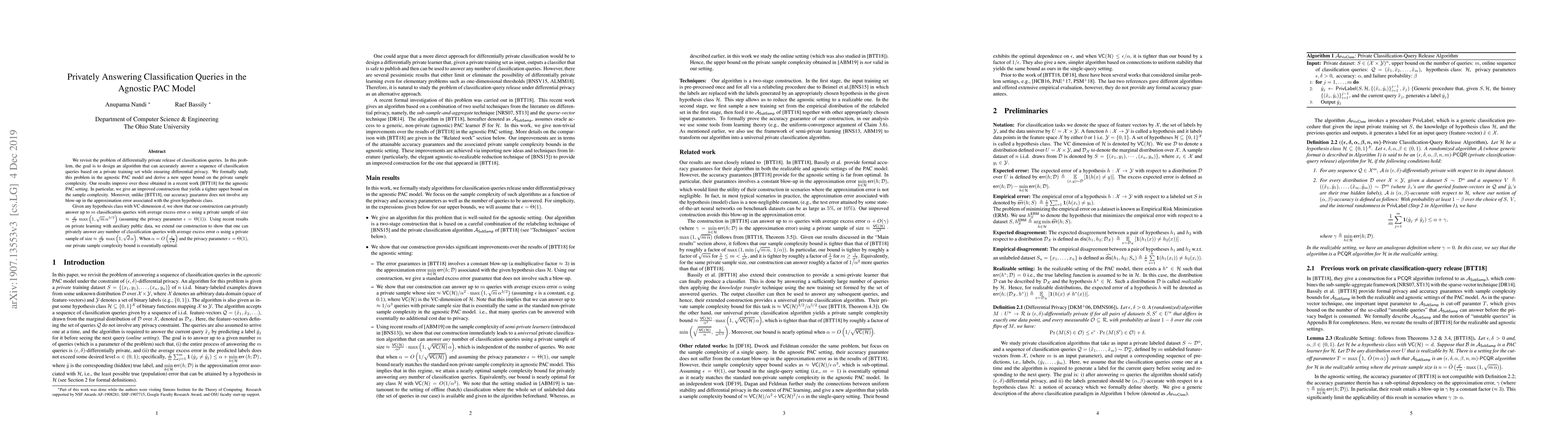This paper proposes a new differentially private algorithm for answering classification queries in the agnostic PAC model, achieving an improved upper bound on private sample complexity without error approximation blow-up. The construction optimally handles classification queries with minimal excess error using a private sample size proportional to the VC-dimension of the hypothesis class.