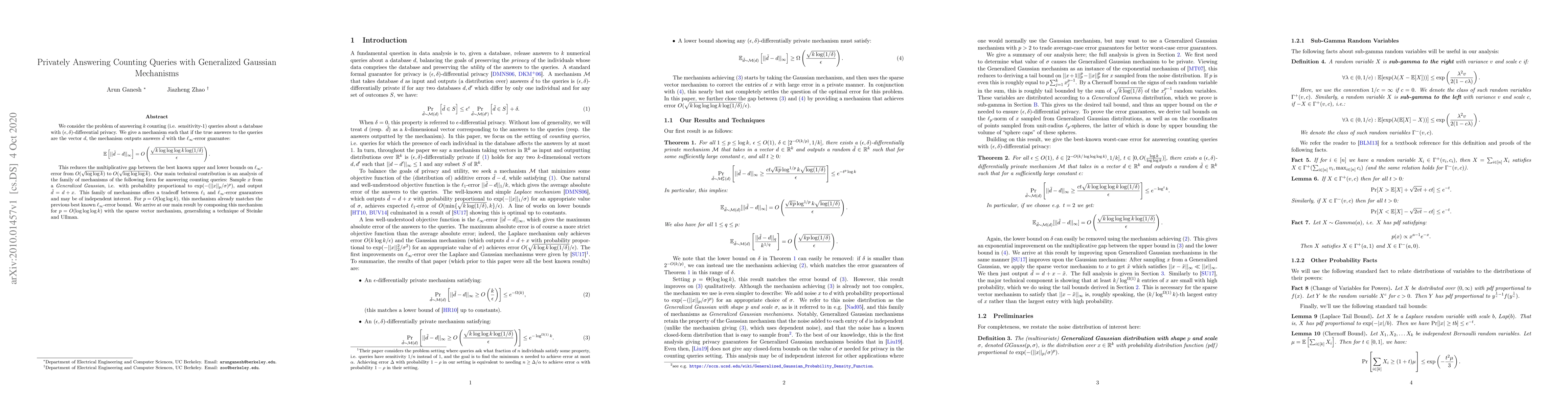This paper proposes a differentially private mechanism for answering counting queries using Generalized Gaussian mechanisms, achieving an $\ell_\infty$-error bound that reduces the multiplicative gap between upper and lower bounds. The mechanism samples from a Generalized Gaussian distribution and outputs perturbed query results, offering a tradeoff between $\ell_1$ and $\ell_\infty$-error guarantees.