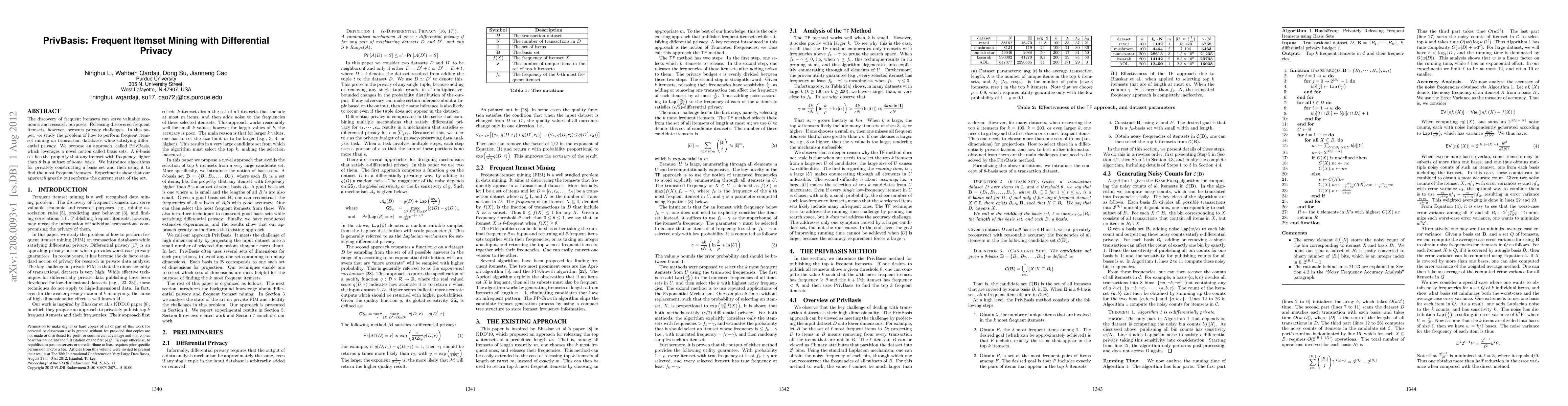 The paper proposes PrivBasis, a method for frequent itemset mining with differential privacy. It introduces the concept of basis sets, specifically theta-basis sets, which have the property that any itemset with frequency higher than theta is a subset of some basis. Algorithms are introduced for privately constructing a basis set and using it to find the most frequent itemsets.