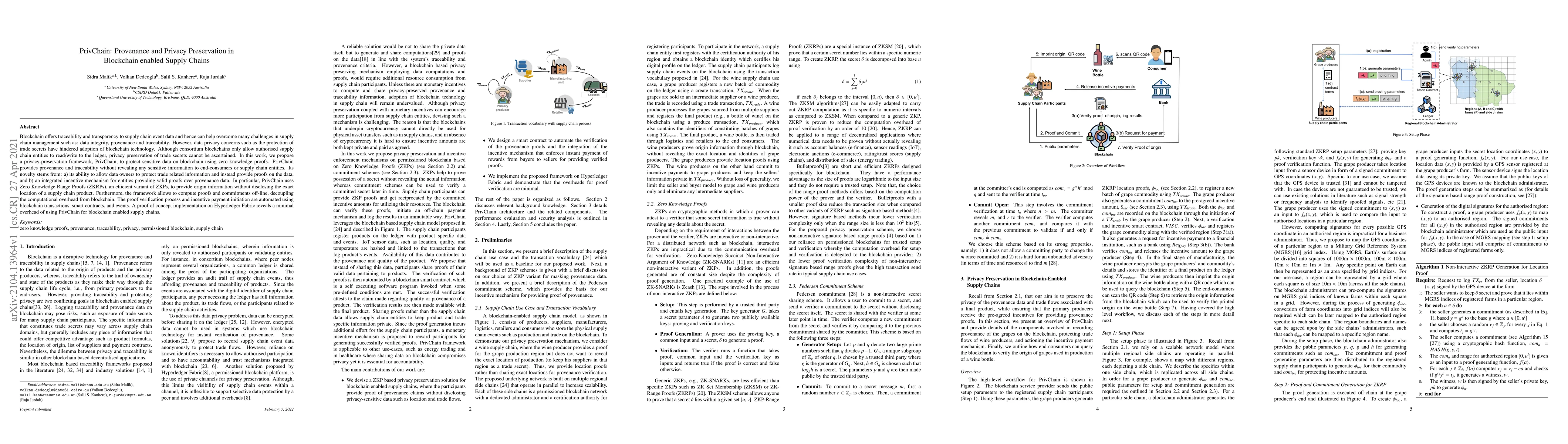 PrivChain proposes a privacy-preserving framework to secure blockchain-enabled supply chains using zero knowledge proofs to ensure data integrity and traceability without exposing sensitive trade secrets. It employs Zero Knowledge Range Proofs to maintain product origin information while minimizing computational overhead.