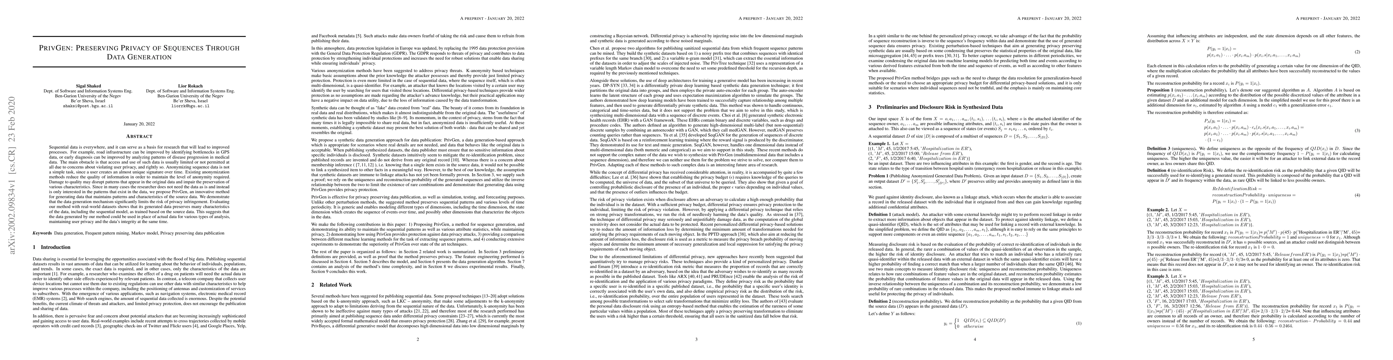 Sequential data is everywhere, and it can serve as a basis for research that will lead to improved processes. For example, road infrastructure can be improved by identifying bottlenecks in GPS data, or early diagnosis can be improved by analyzing patterns of disease progression in medical data. The main obstacle is that access and use of such data is usually limited or not permitted at all due to concerns about violating user privacy, and rightly so. Anonymizing sequence data is not a simple task, since a user creates an almost unique signature over time. Existing anonymization methods reduce the quality of information in order to maintain the level of anonymity required. Damage to quality may disrupt patterns that appear in the original data and impair the preservation of various characteristics. Since in many cases the researcher does not need the data as is and instead is only interested in the patterns that exist in the data, we propose PrivGen, an innovative method for generating data that maintains patterns and characteristics of the source data. We demonstrate that the data generation mechanism significantly limits the risk of privacy infringement. Evaluating our method with real-world datasets shows that its generated data preserves many characteristics of the data, including the sequential model, as trained based on the source data. This suggests that the data generated by our method could be used in place of actual data for various types of analysis, maintaining user privacy and the data's integrity at the same time.