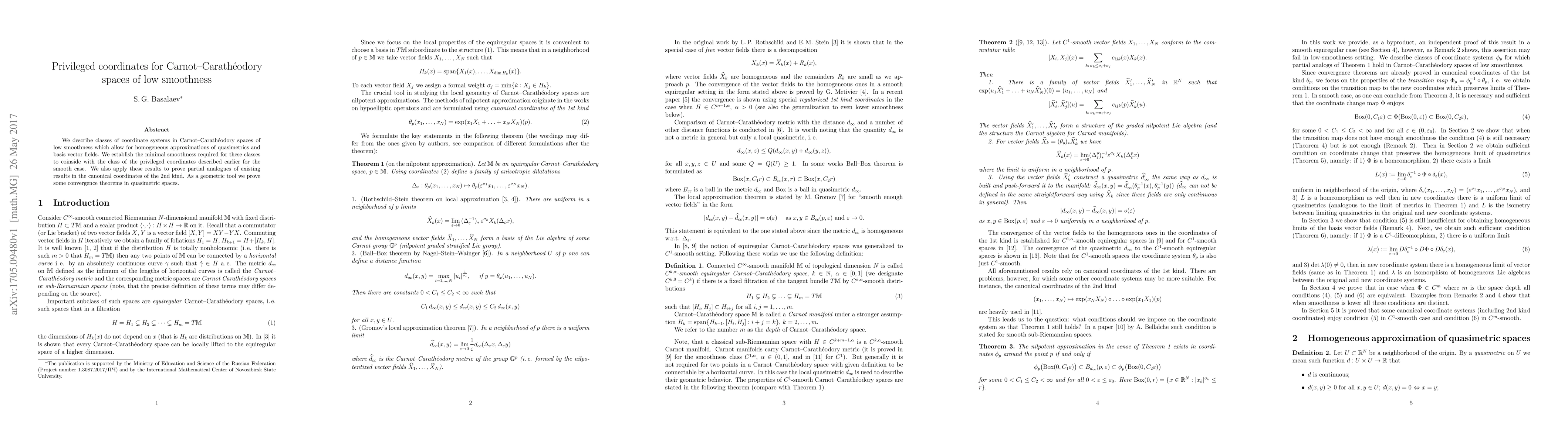 We describe classes of coordinate systems in Carnot-Carath\'eodory spaces of low smoothness which allow for homogeneous approximations of quasimetrics and basis vector fields. We establish the minimal smoothness required for these classes to coinside with the class of the privileged coordinates described earlier for the smooth case. We also apply these results to prove partial analogues of existing results in the canonical coordinates of the 2nd kind. As a geometric tool we prove some convergence theorems in quasimetric spaces.