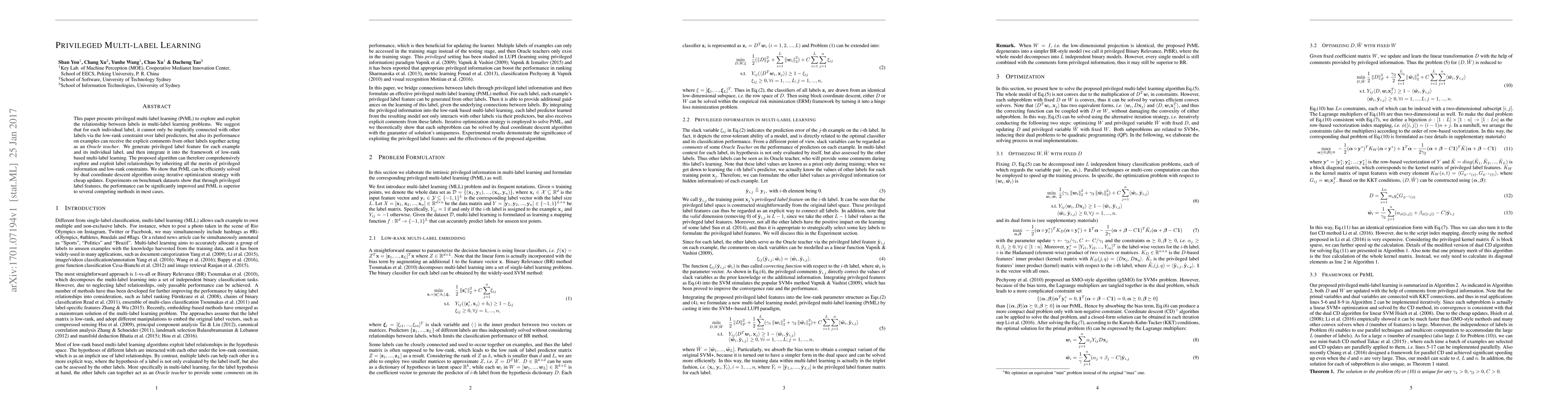 This paper introduces privileged multi-label learning (PrML) to leverage relationships between labels in multi-label problems, using privileged label features for enhanced performance. The proposed algorithm integrates these features into a low-rank learning framework, achieving significant improvements over competing methods.