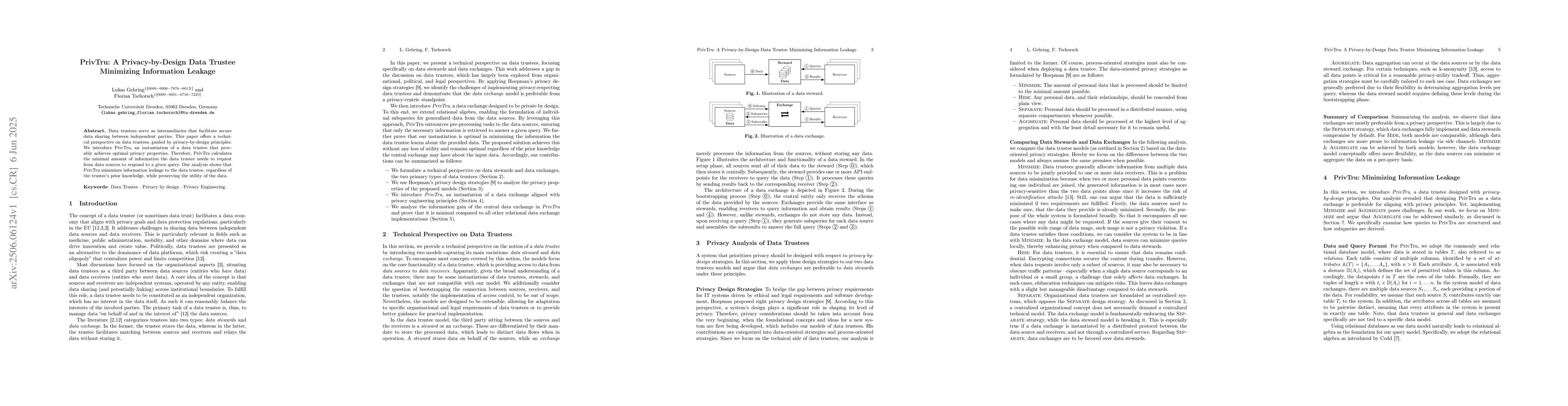 The paper introduces PrivTru, a privacy-focused data trustee that minimizes information leakage by calculating the least data needed to answer queries, adhering to privacy-by-design principles and preserving data utility.