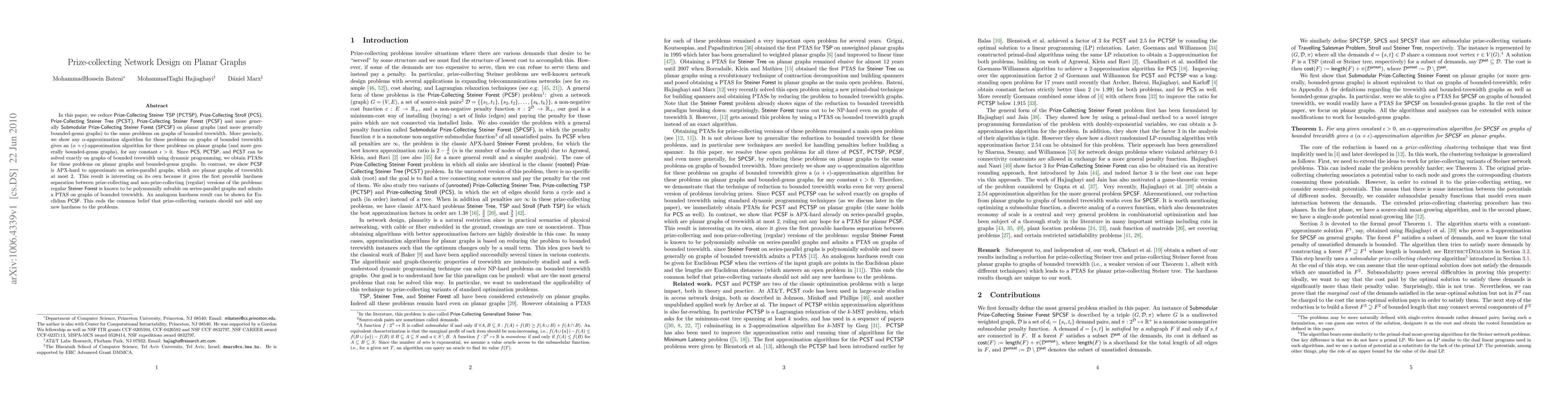 This paper establishes approximation algorithms for prize-collecting variants of Steiner problems on planar and bounded-genus graphs by reducing them to equivalent problems on graphs of bounded treewidth, yielding PTASs. It also demonstrates that Submodular Prize-Collecting Steiner Forest is APX-hard on series-parallel graphs, showing a hardness separation between prize-collecting and non-prize-collecting versions of these problems.