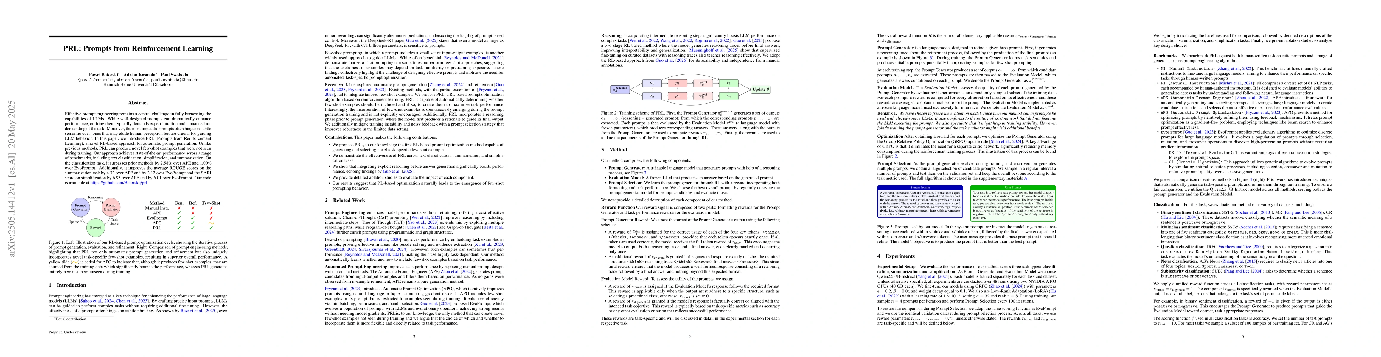 The main technical contribution is the development of PRL, an RL-based approach for generating prompts that outperforms existing methods.