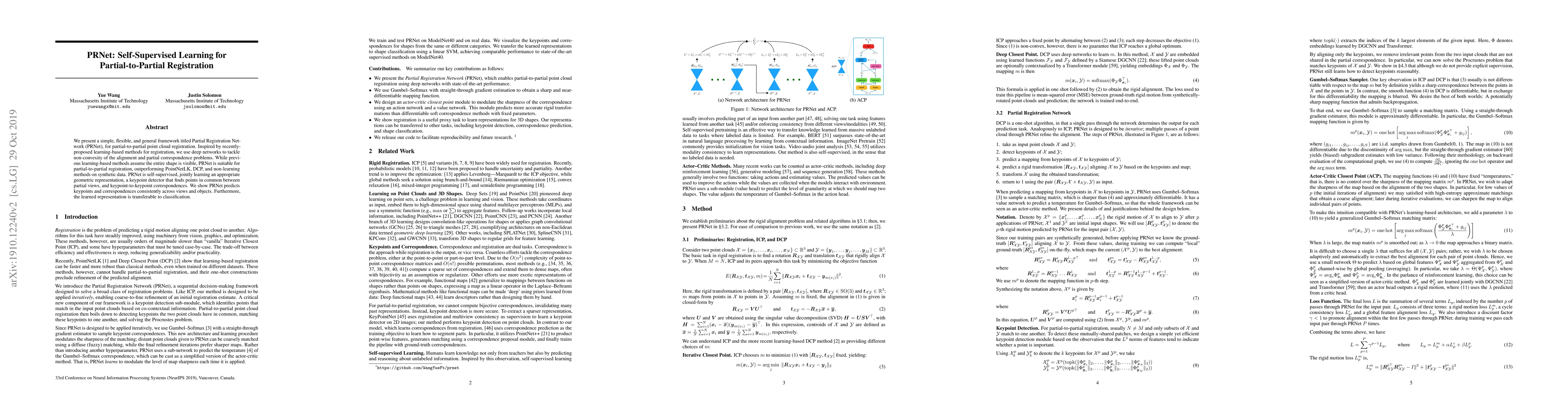 PRNet is a self-supervised deep learning framework for partial-to-partial point cloud registration, outperforming existing methods on synthetic data by learning geometric representations, keypoint detectors, and correspondences without requiring full shape visibility. The learned representation also aids in classification tasks.