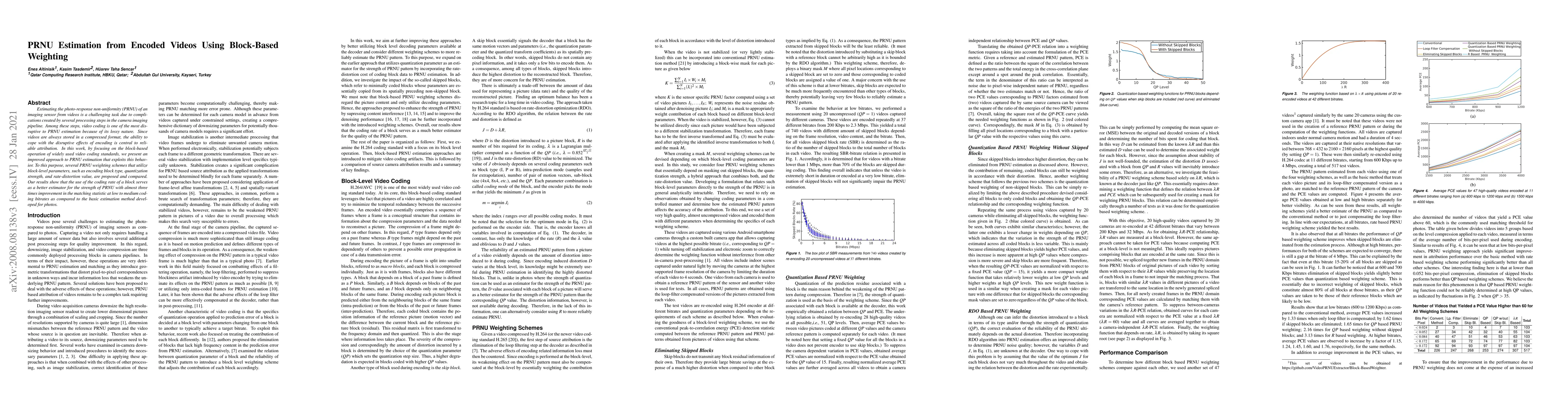 This paper proposes an improved method for estimating the photo-response non-uniformity (PRNU) from encoded videos by leveraging block-based weighting schemes. The study shows that the coding rate of video blocks significantly enhances PRNU estimation, achieving nearly three times better matching statistics compared to traditional photo-based methods.