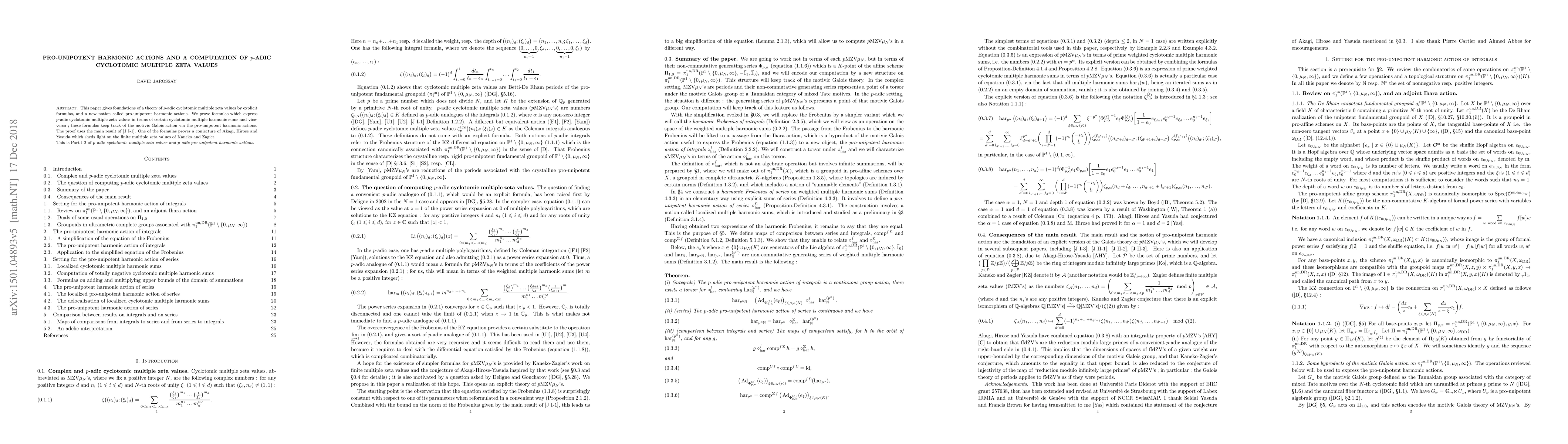 This paper gives foundations of a theory of $p$-adic cyclotomic multiple zeta values by explicit formulas, and a new notion called pro-unipotent harmonic actions. We prove formulas which express $p$-adic cyclotomic multiple zeta values in terms of certain cyclotomic multiple harmonic sums and vice-versa ; these formulas keep track of the motivic Galois action via the pro-unipotent harmonic actions. The proof uses the main result of \cite{I-1}. One of the formulas proves a conjecture of Akagi, Hirose and Yasuda which sheds light on the finite multiple zeta values of Kaneko and Zagier.