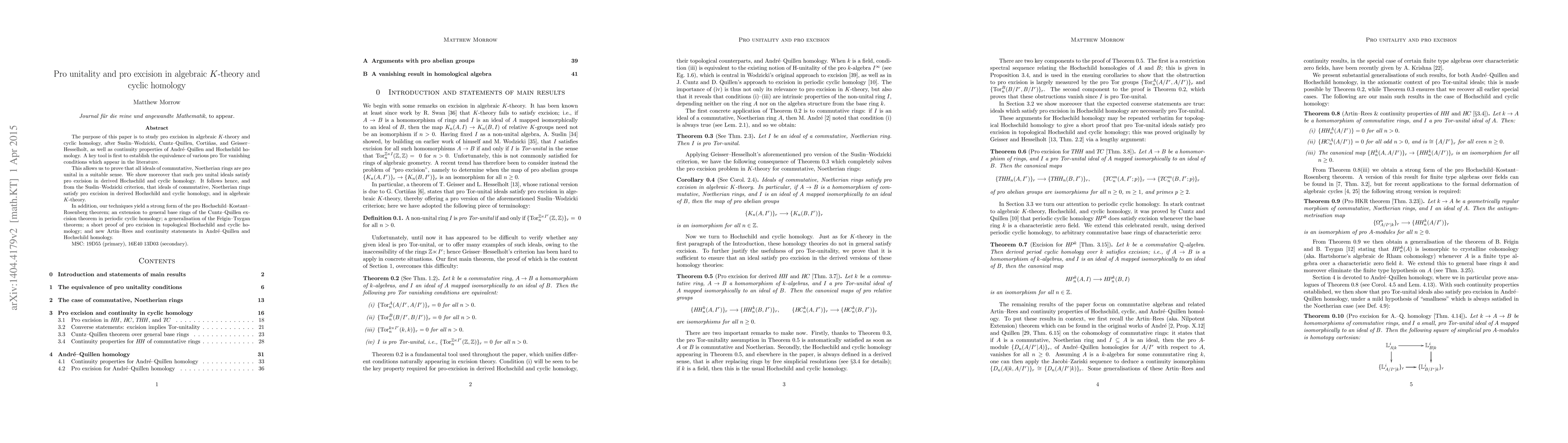 We study pro excision in algebraic K-theory, following Suslin--Wodzicki, Cuntz--Quillen, Corti\~nas, and Geisser--Hesselholt, as well as Artin--Rees and continuity properties of Andr\'e--Quillen, Hochschild, and cyclic homology. Our key tool is to first establish the equivalence of various pro Tor vanishing conditions which appear in the literature. Using this we prove that all ideals of commutative, Noetherian rings are pro unital in a certain sense, and show that such ideals satisfy pro excision in $K$-theory as well as in cyclic and topological cyclic homology. In addition, our techniques yield a strong form of the pro Hochschild--Kostant--Rosenberg theorem, an extension to general base rings of the Cuntz--Quillen excision theorem in periodic cyclic homology, and a generalisation of the Fe\u{\i}gin--Tsygan theorem.