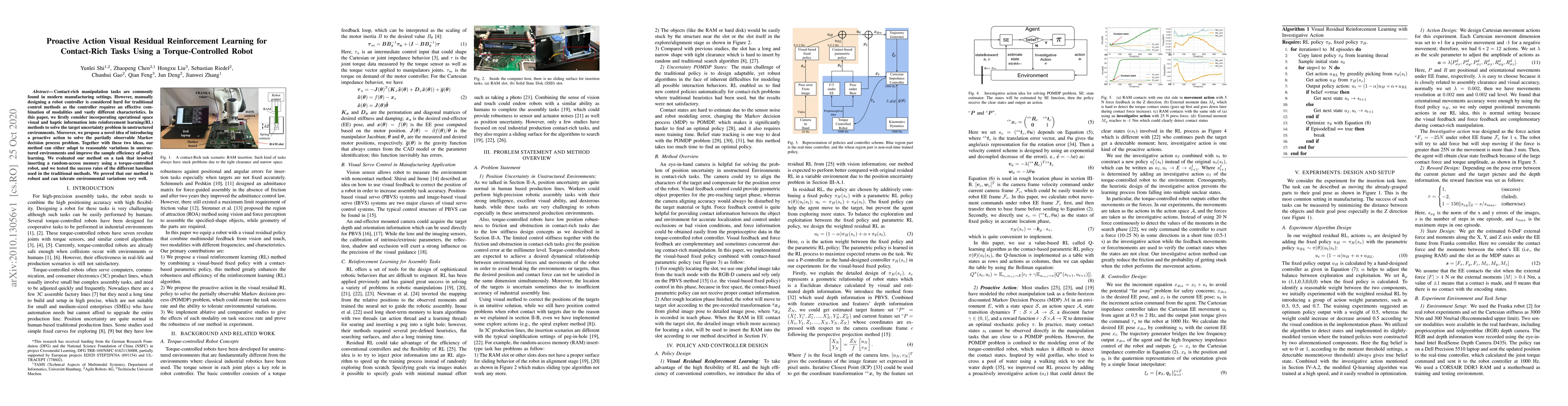 Contact-rich manipulation tasks are commonly found in modern manufacturing settings. However, manually designing a robot controller is considered hard for traditional control methods as the controller requires an effective combination of modalities and vastly different characteristics. In this paper, we firstly consider incorporating operational space visual and haptic information into reinforcement learning(RL) methods to solve the target uncertainty problem in unstructured environments. Moreover, we propose a novel idea of introducing a proactive action to solve the partially observable Markov decision process problem. Together with these two ideas, our method can either adapt to reasonable variations in unstructured environments and improve the sample efficiency of policy learning. We evaluated our method on a task that involved inserting a random-access memory using a torque-controlled robot, and we tested the success rates of the different baselines used in the traditional methods. We proved that our method is robust and can tolerate environmental variations very well.