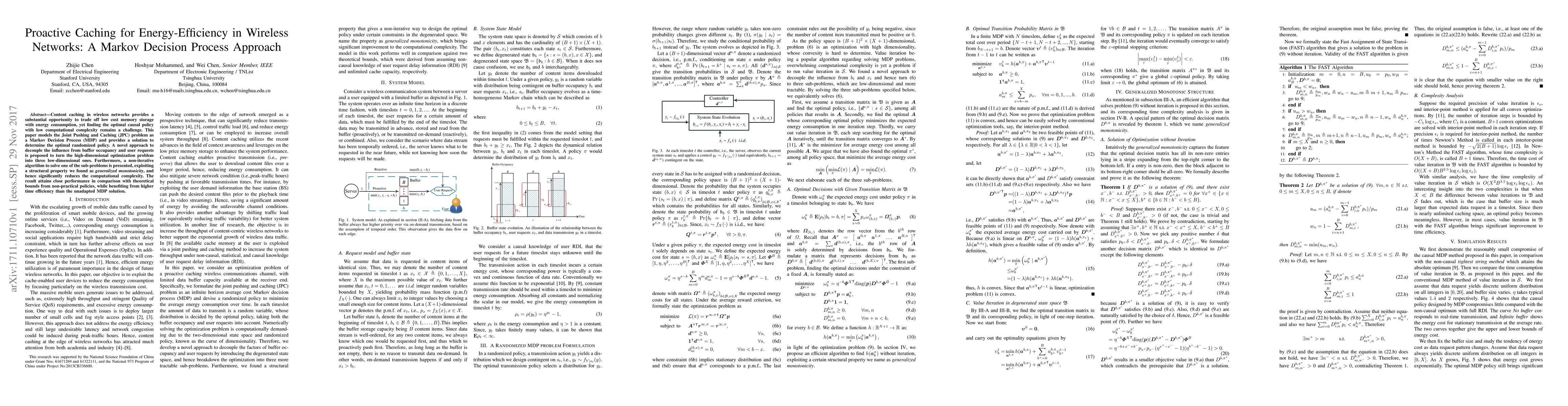 This paper proposes a Markov Decision Process (MDP) approach to optimize proactive caching in wireless networks for energy efficiency. It introduces a novel method to break down the high-dimensional problem into three low-dimensional sub-problems, leveraging a generalized monotonicity property, which significantly reduces computational complexity while achieving near-optimal performance.