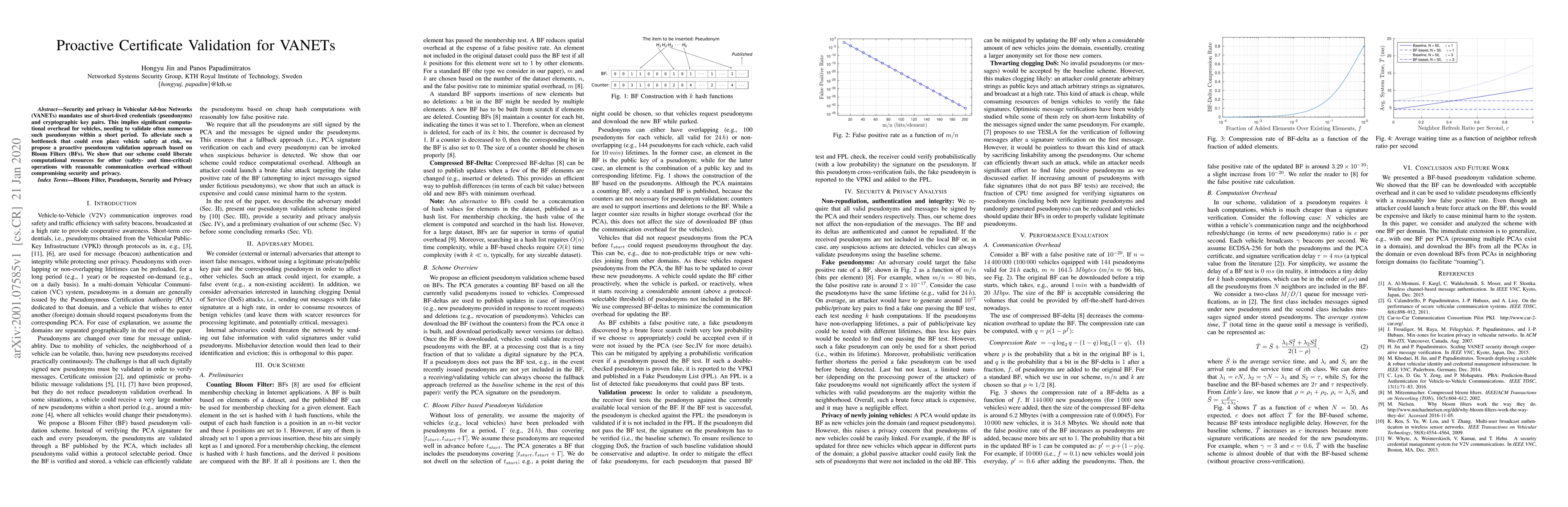 Security and privacy in Vehicular Ad-hoc Networks (VANETs) mandates use of short-lived credentials (pseudonyms) and cryptographic key pairs. This implies significant computational overhead for vehicles, needing to validate often numerous such pseudonyms within a short period. To alleviate such a bottleneck that could even place vehicle safety at risk, we propose a proactive pseudonym validation approach based on Bloom Filters (BFs). We show that our scheme could liberate computational resources for other (safety- and time-critical) operations with reasonable communication overhead without compromising security and privacy.