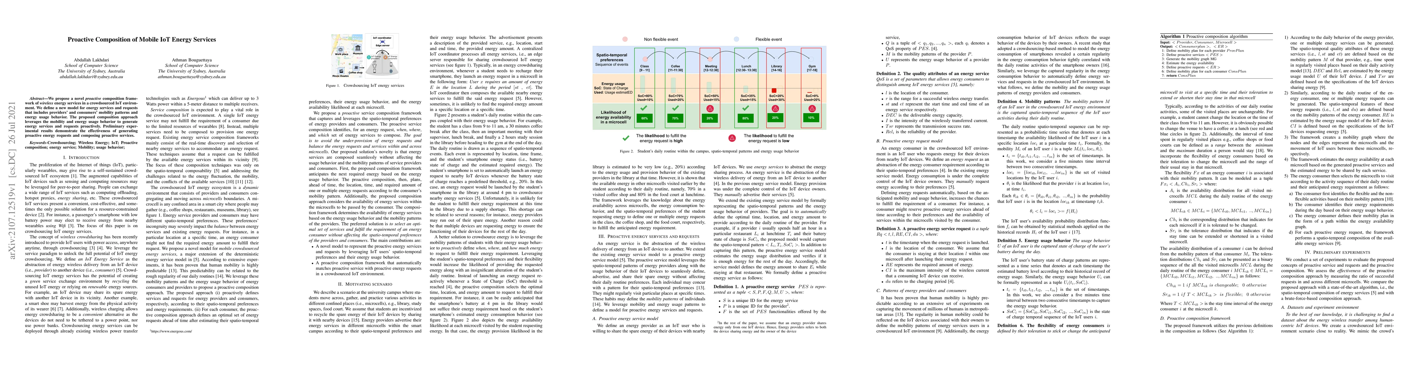 This paper introduces a proactive composition framework for wireless energy services in a crowdsourced IoT environment, leveraging mobility and energy usage behavior to generate proactive energy requests and services. Preliminary experiments show the effectiveness of this approach.