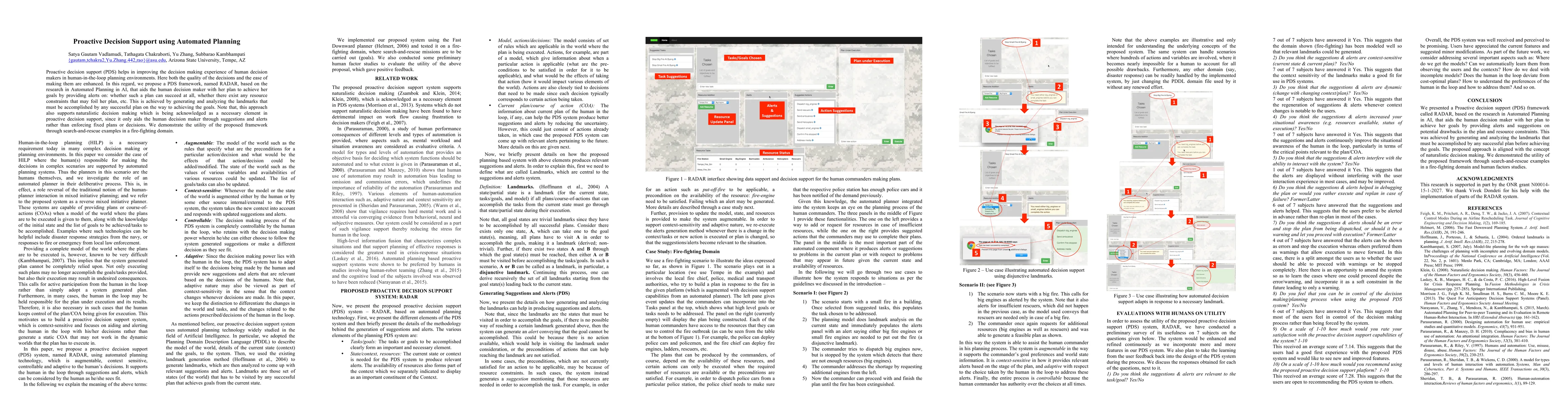 A new proactive decision support framework called RADAR is proposed to aid human decision makers in planning environments by providing alerts on plan feasibility and resource constraints. The framework demonstrates its utility in a fire-fighting domain through search-and-rescue examples.