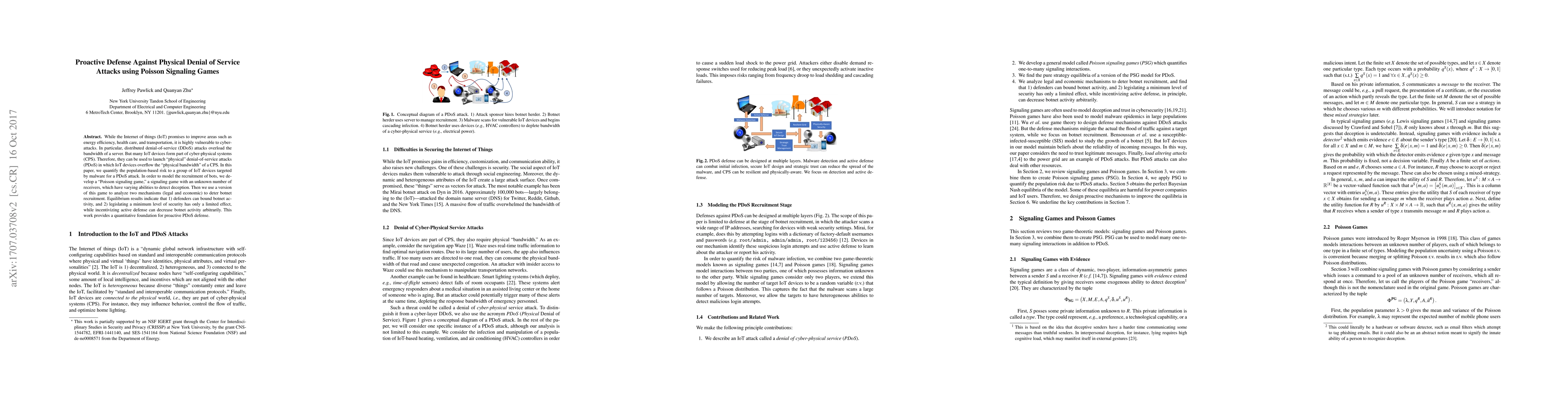 While the Internet of things (IoT) promises to improve areas such as energy efficiency, health care, and transportation, it is highly vulnerable to cyberattacks. In particular, distributed denial-of-service (DDoS) attacks overload the bandwidth of a server. But many IoT devices form part of cyber-physical systems (CPS). Therefore, they can be used to launch "physical" denial-of-service attacks (PDoS) in which IoT devices overflow the "physical bandwidth" of a CPS. In this paper, we quantify the population-based risk to a group of IoT devices targeted by malware for a PDoS attack. In order to model the recruitment of bots, we develop a "Poisson signaling game," a signaling game with an unknown number of receivers, which have varying abilities to detect deception. Then we use a version of this game to analyze two mechanisms (legal and economic) to deter botnet recruitment. Equilibrium results indicate that 1) defenders can bound botnet activity, and 2) legislating a minimum level of security has only a limited effect, while incentivizing active defense can decrease botnet activity arbitrarily. This work provides a quantitative foundation for proactive PDoS defense.