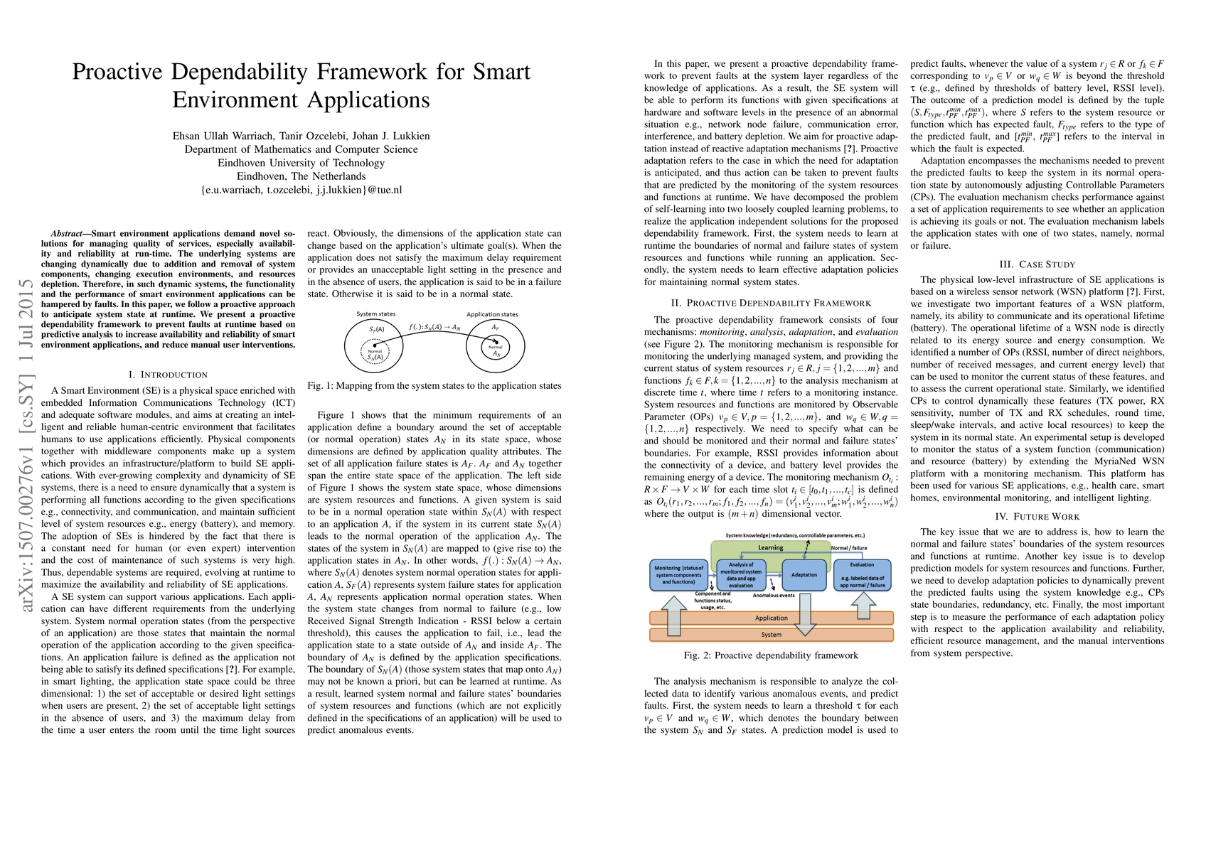 A proactive dependability framework is presented to anticipate system faults in smart environment applications, increasing availability and reliability through predictive analysis and reducing manual user interventions.