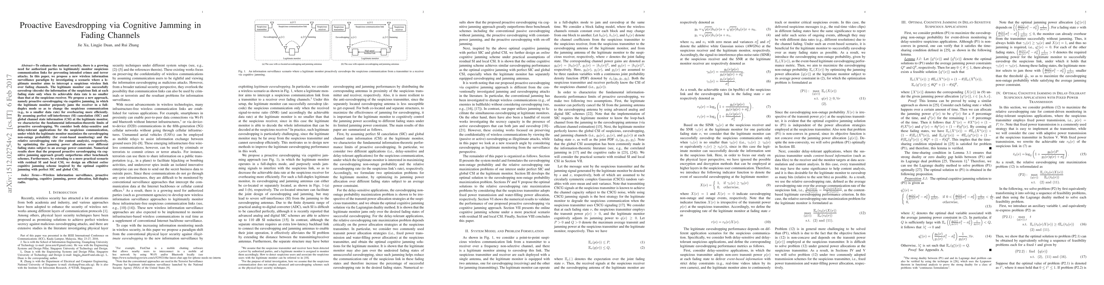 This paper proposes a novel wireless surveillance method called proactive eavesdropping via cognitive jamming to enable legitimate monitors to intercept suspicious communications over fading channels. The method involves intentionally jamming the suspicious receiver to reduce its data rate, thereby improving the monitor's eavesdropping efficiency. The approach optimizes jamming power allocation to maximize eavesdropping performance for different application types.