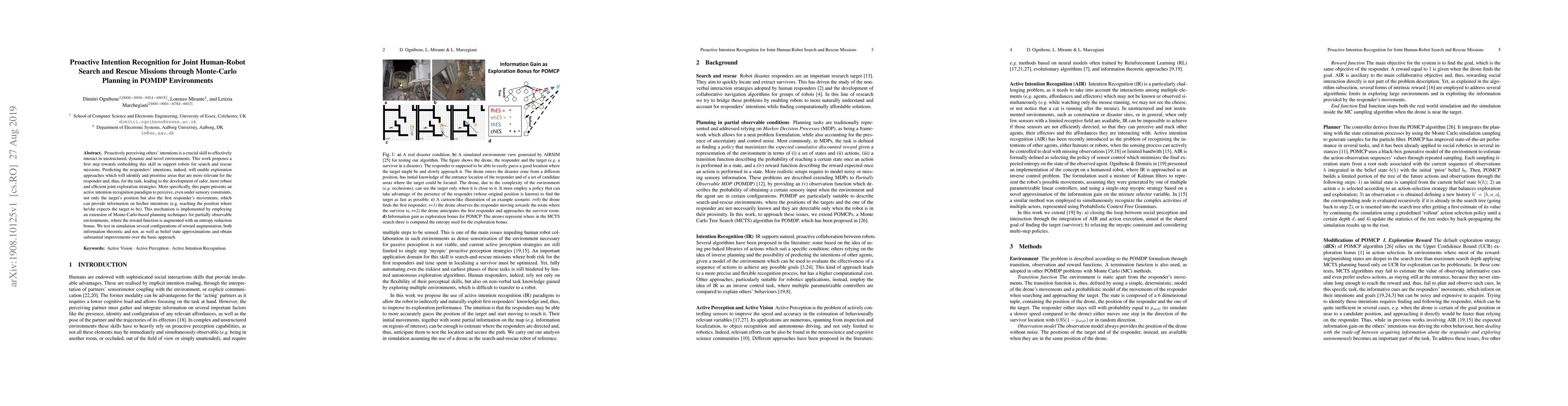 Proactively perceiving others' intentions is a crucial skill to effectively interact in unstructured, dynamic and novel environments. This work proposes a first step towards embedding this skill in support robots for search and rescue missions. Predicting the responders' intentions, indeed, will enable exploration approaches which will identify and prioritise areas that are more relevant for the responder and, thus, for the task, leading to the development of safer, more robust and efficient joint exploration strategies. More specifically, this paper presents an active intention recognition paradigm to perceive, even under sensory constraints, not only the target's position but also the first responder's movements, which can provide information on his/her intentions (e.g. reaching the position where he/she expects the target to be). This mechanism is implemented by employing an extension of Monte-Carlo-based planning techniques for partially observable environments, where the reward function is augmented with an entropy reduction bonus. We test in simulation several configurations of reward augmentation, both information theoretic and not, as well as belief state approximations and obtain substantial improvements over the basic approach.