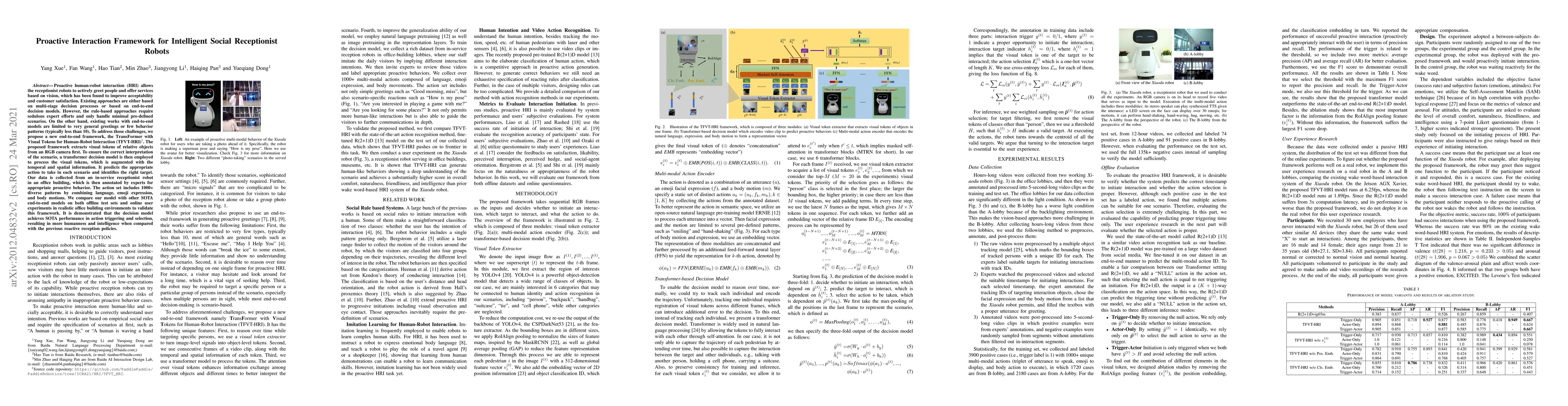 A new end-to-end framework, TransFormer with Visual Tokens for Human-Robot Interaction (TFVT-HRI), improves human-robot interaction by predicting actions in diverse scenarios, achieving state-of-the-art performance.