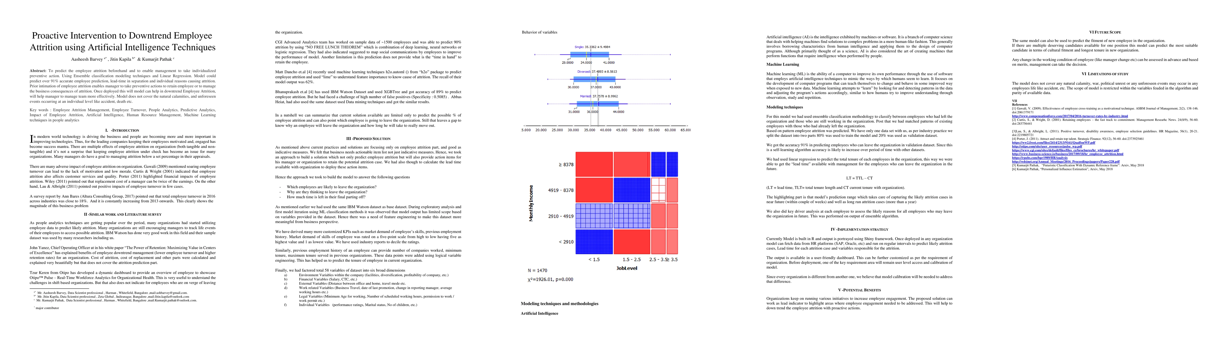 To predict the employee attrition beforehand and to enable management to take individualized preventive action. Using Ensemble classification modeling techniques and Linear Regression. Model could predict over 91% accurate employee prediction, lead-time in separation and individual reasons causing attrition. Prior intimation of employee attrition enables manager to take preventive actions to retain employee or to manage the business consequences of attrition. Once deployed this will model can help in downtrend Employee Attrition, will help manager to manage team more effectively. Model does not cover the natural calamities, and unforeseen events occurring at an individual level like accident, death etc.